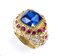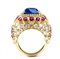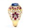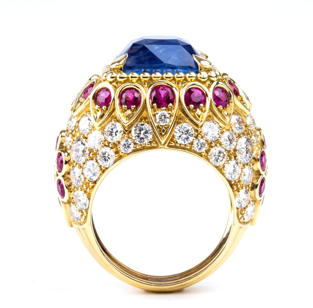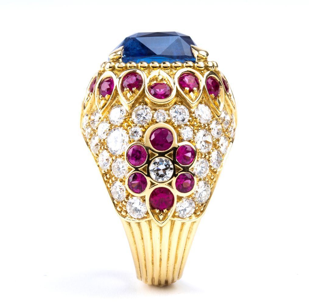 realizzato in oro giallo 18k, modellato come una fascia bombata, incastonato con zaffiro Burma incorniciato da rubini, montatura decorata con pavé di diamanti.
