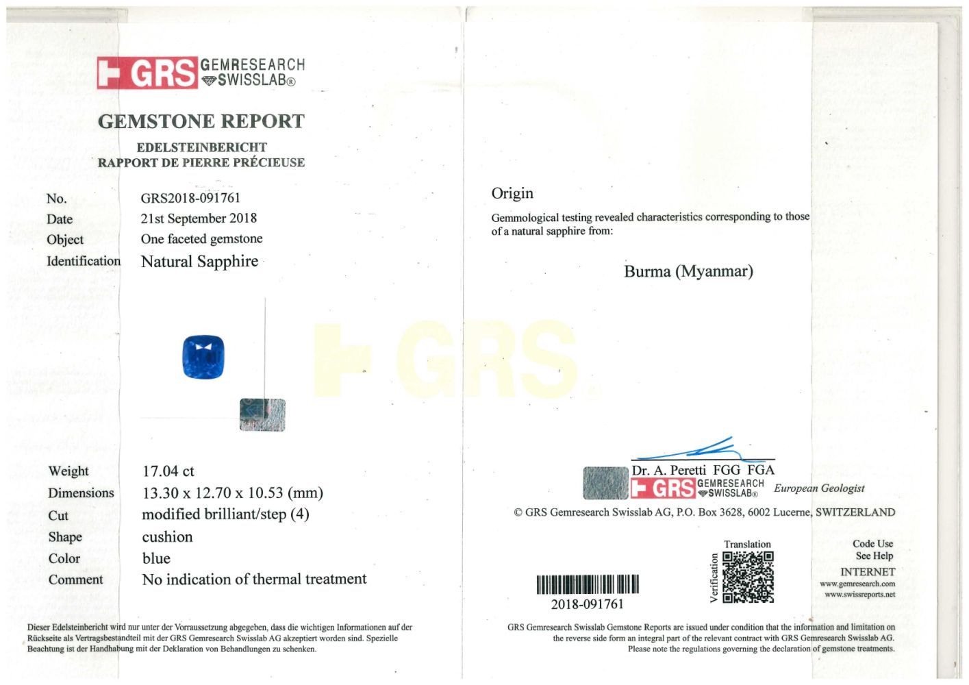 Accompagnato da certificato gemmologico GLS (Gemresearch Swisslab).