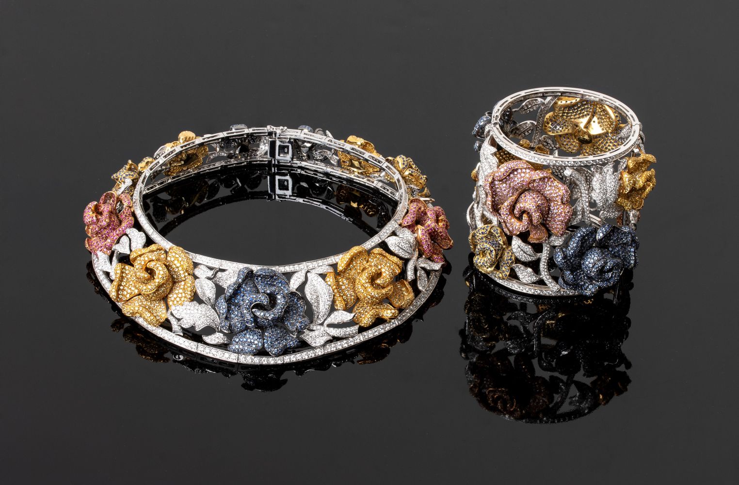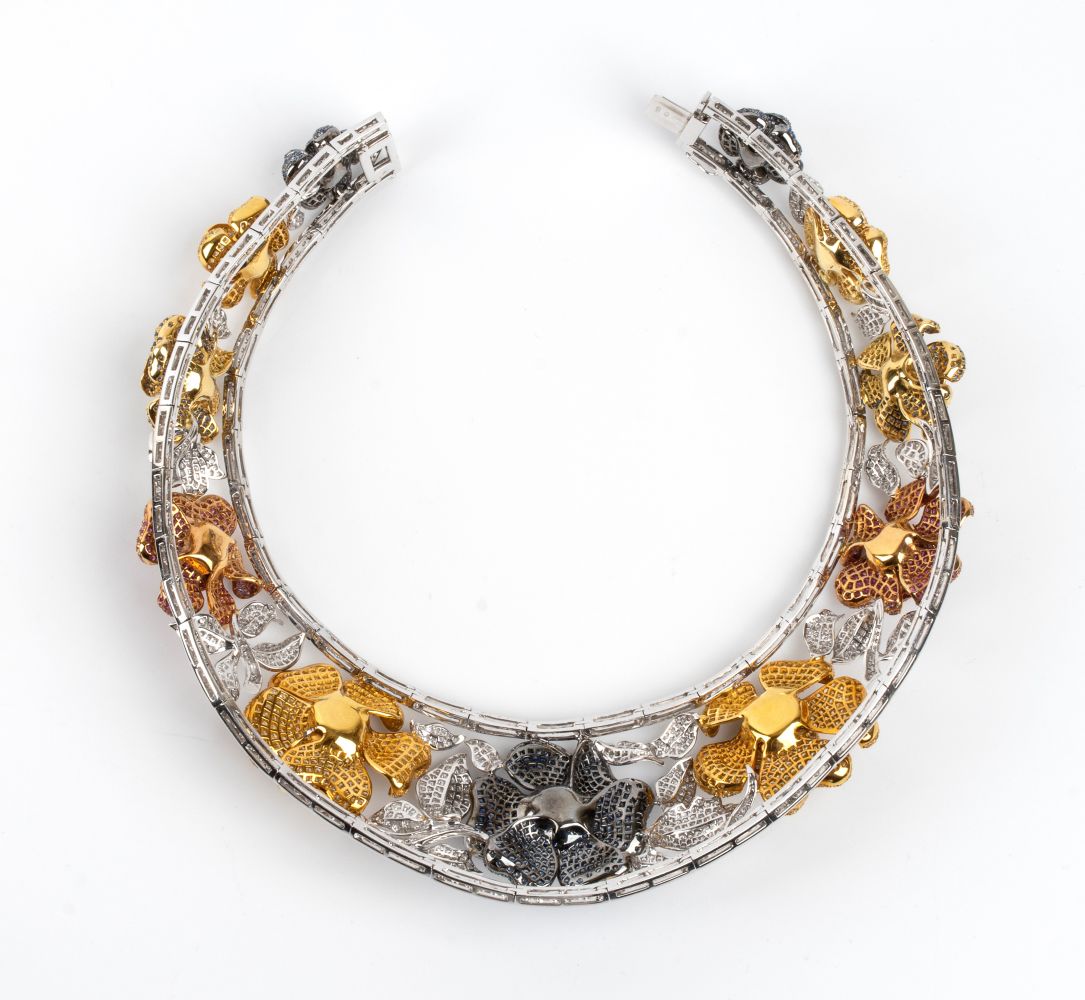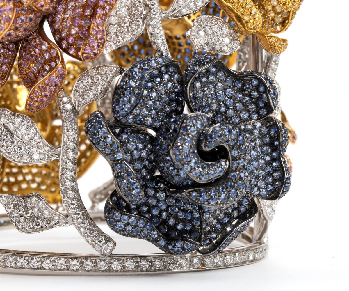 bracciale e collana rigidi in oro bianco 18k con chiusura a scomparsa. La demi parure presenta decorazioni in motivi a foglie e fiori impreziositi da zaffiri, corindoni rosa e corindoni gialli per circa 138.00 ct, e diamanti di forma rotonda, taglio brillante, per circa 57.00 ct, F-G, VVS-VS.