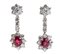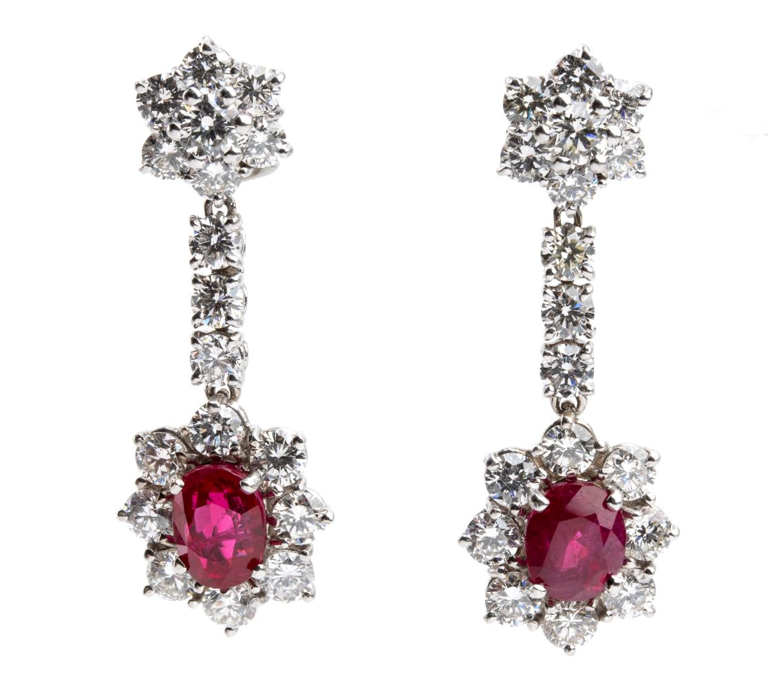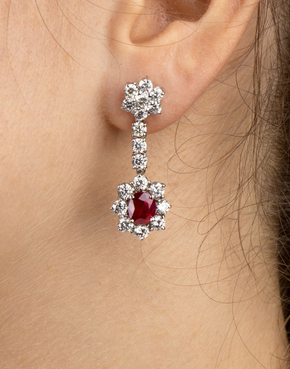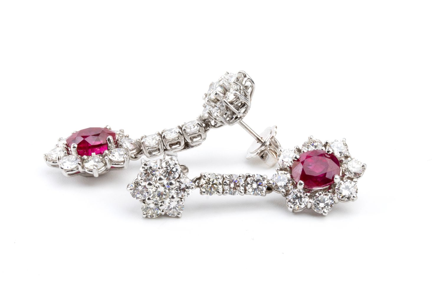in oro bianco 18k, ciascuno impreziosito da rubino contornato e sormontato da diamanti.