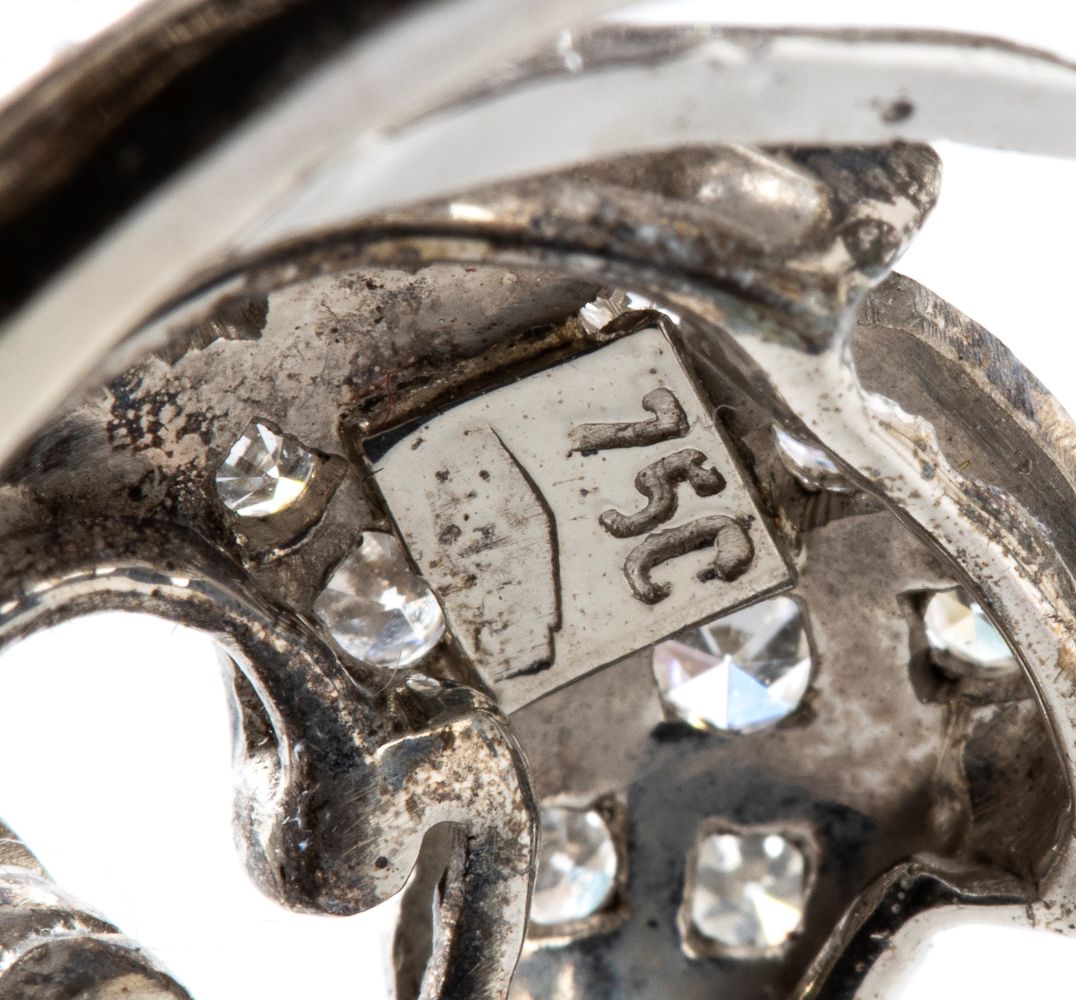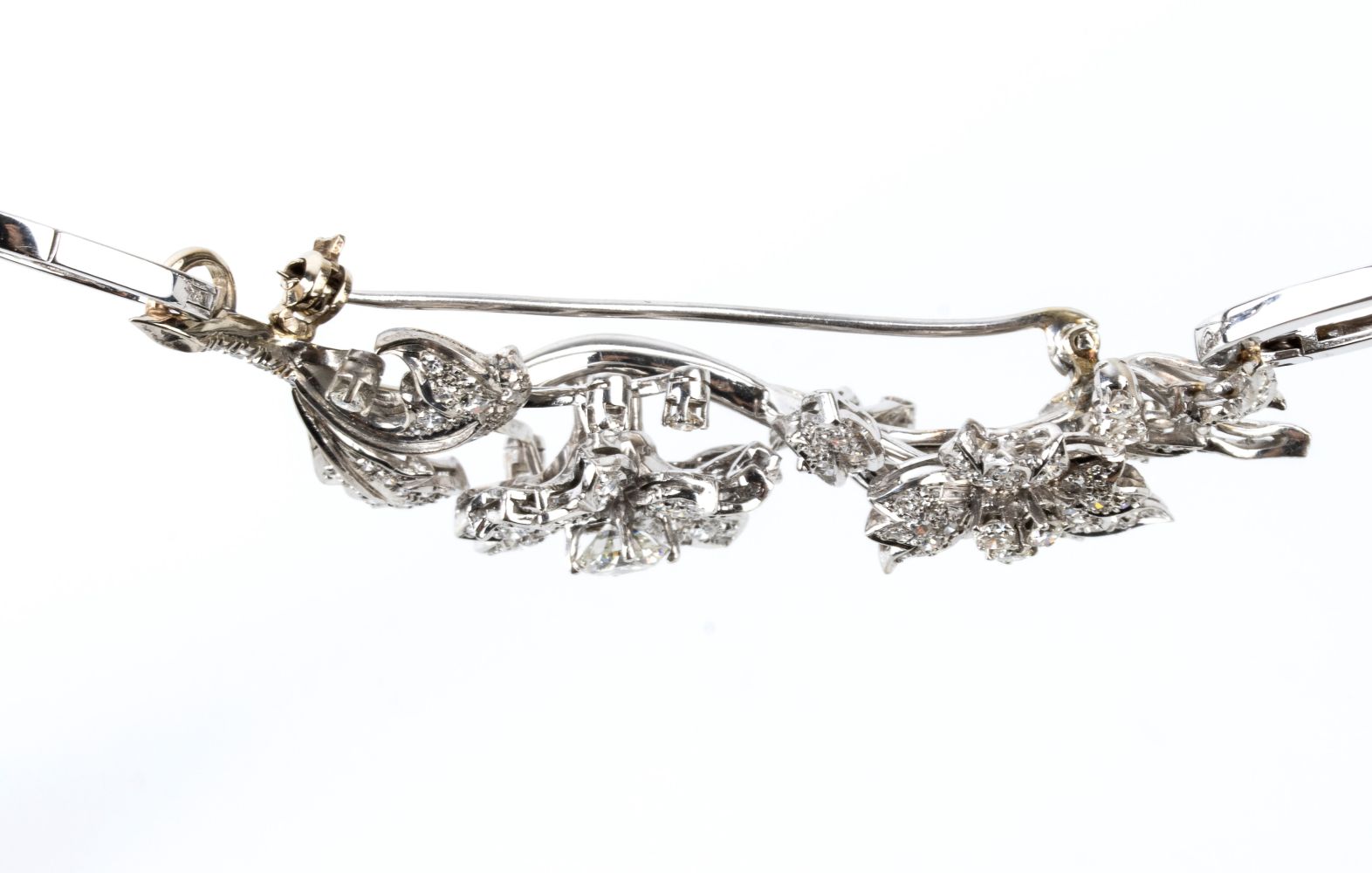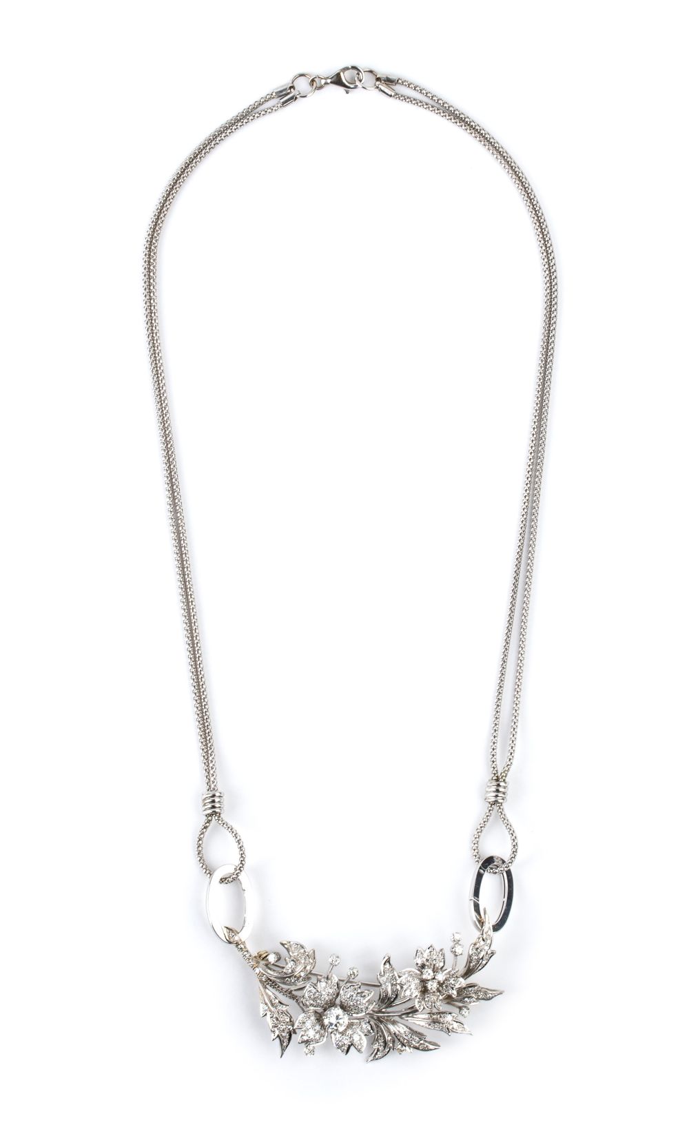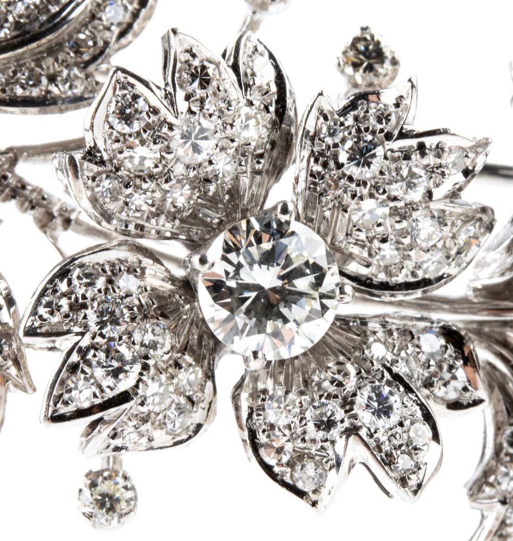 spilla a motivo di tralcio fiorito in oro bianco 18k, impreziosita da diamanti.