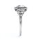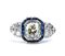 realizzato in platino, traforato a motivi geometrici, incastonato con diamante di forma a cuscino incorniciato da zaffiri; lati della montatura decorati con altri piccoli diamanti.
