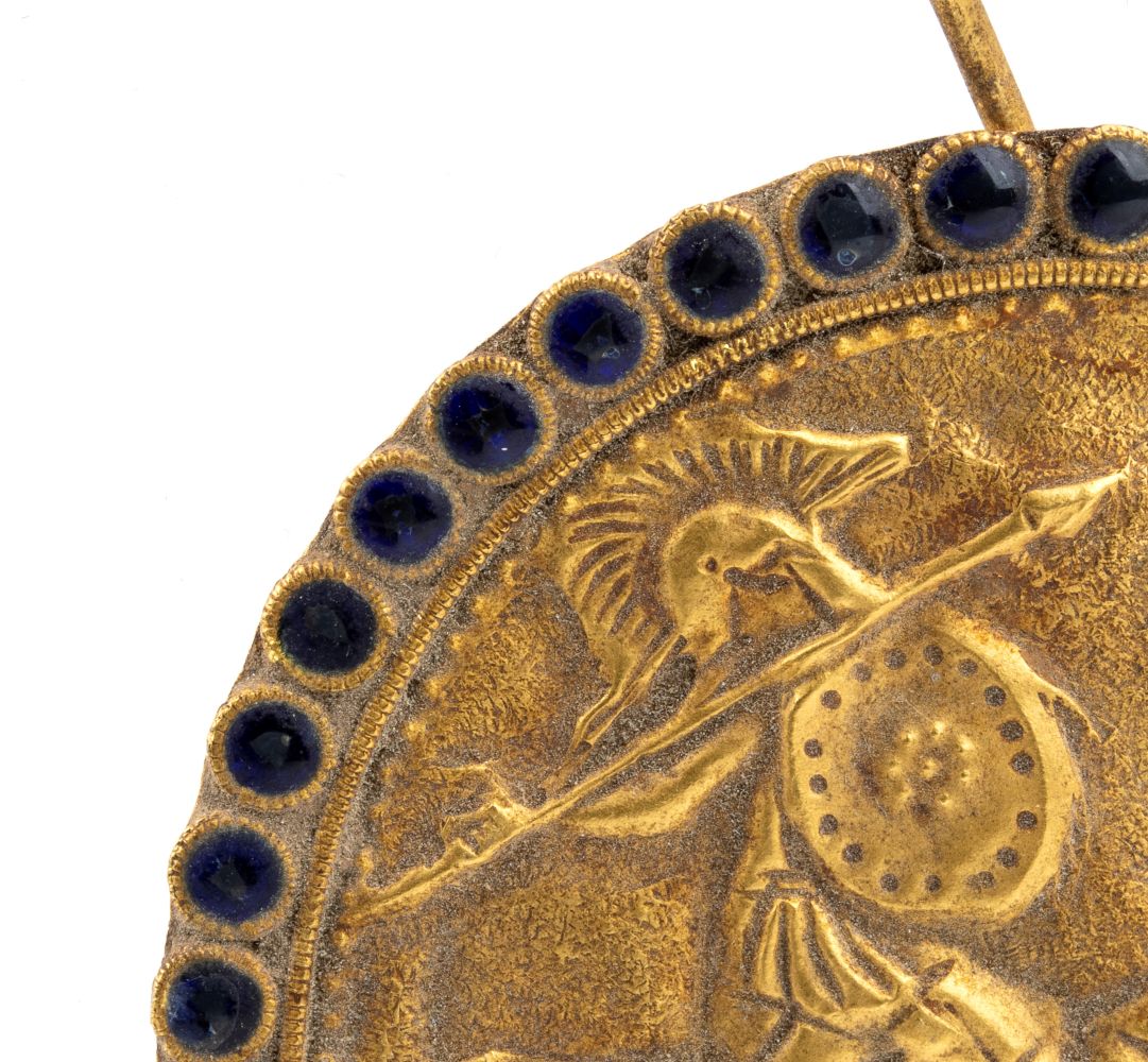 realizzati in oro ad alto titolo da lastra e decorati a rilievo con una scena di combattimento classico circondata da una cornice di paste vitree blu.