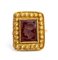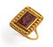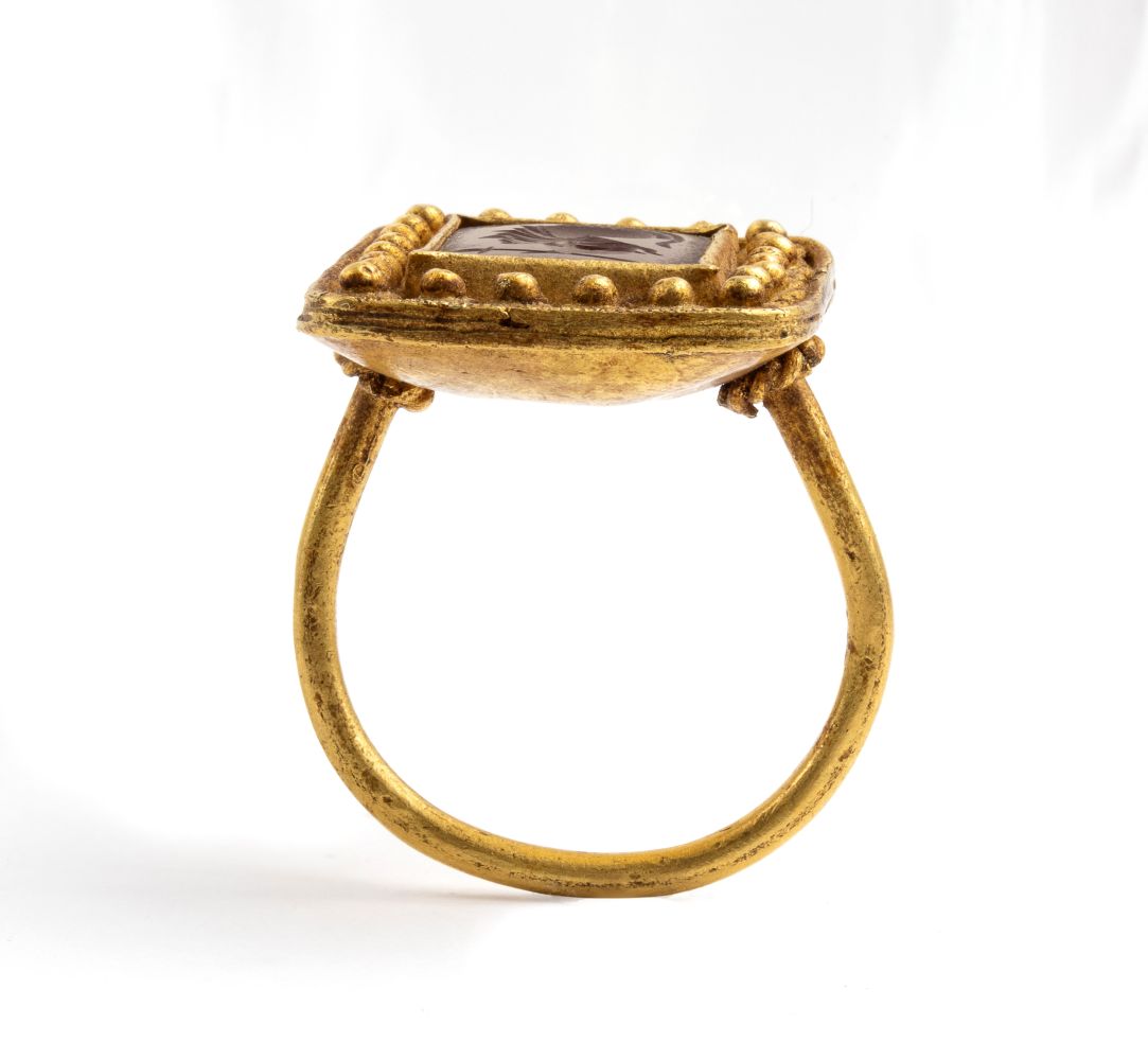 di forma rettangolare in oro ad alto titolo, decorato con grani disposti a cornice di una corniola incisa raffigurante profilo di testa di guerriero classico.