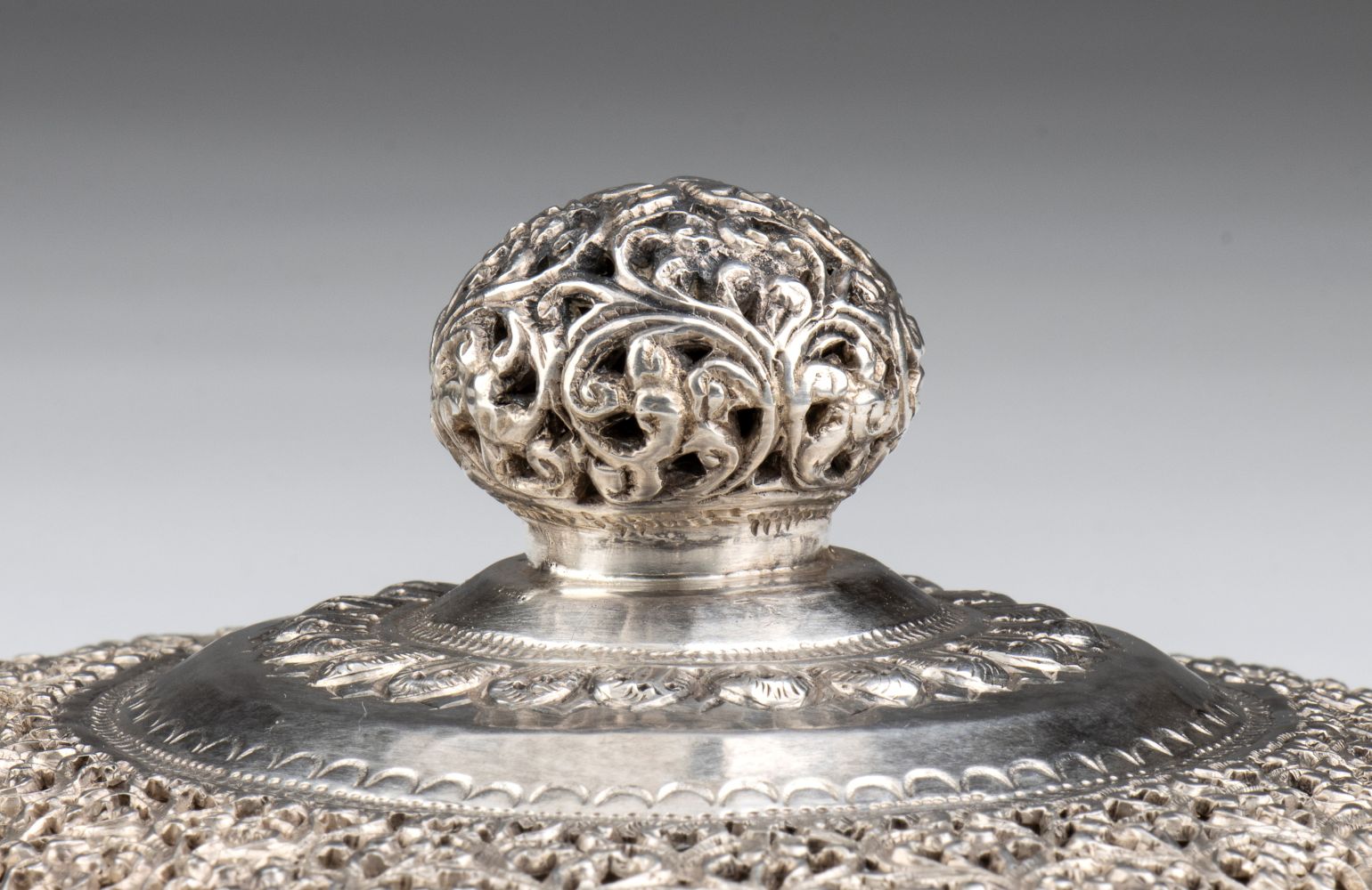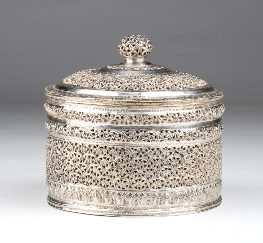 Scatola porta noci di Betel in argento Birmania, XIX secolo Altezza x diametro: 12,5 x 13,5 cm. Peso: 396 gr.