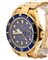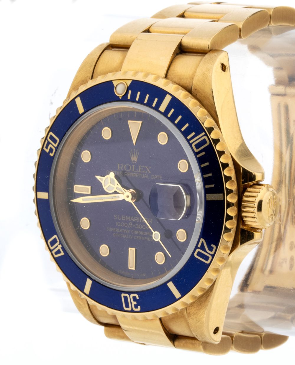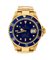 cassa e bracciale in oro giallo 18k, quadrante e ghiera blu, lancetta mercedes e indici bicchierini. Movimento meccanico automatico con rimessa rapida del datario. Referenza 16618, calibro 3135.