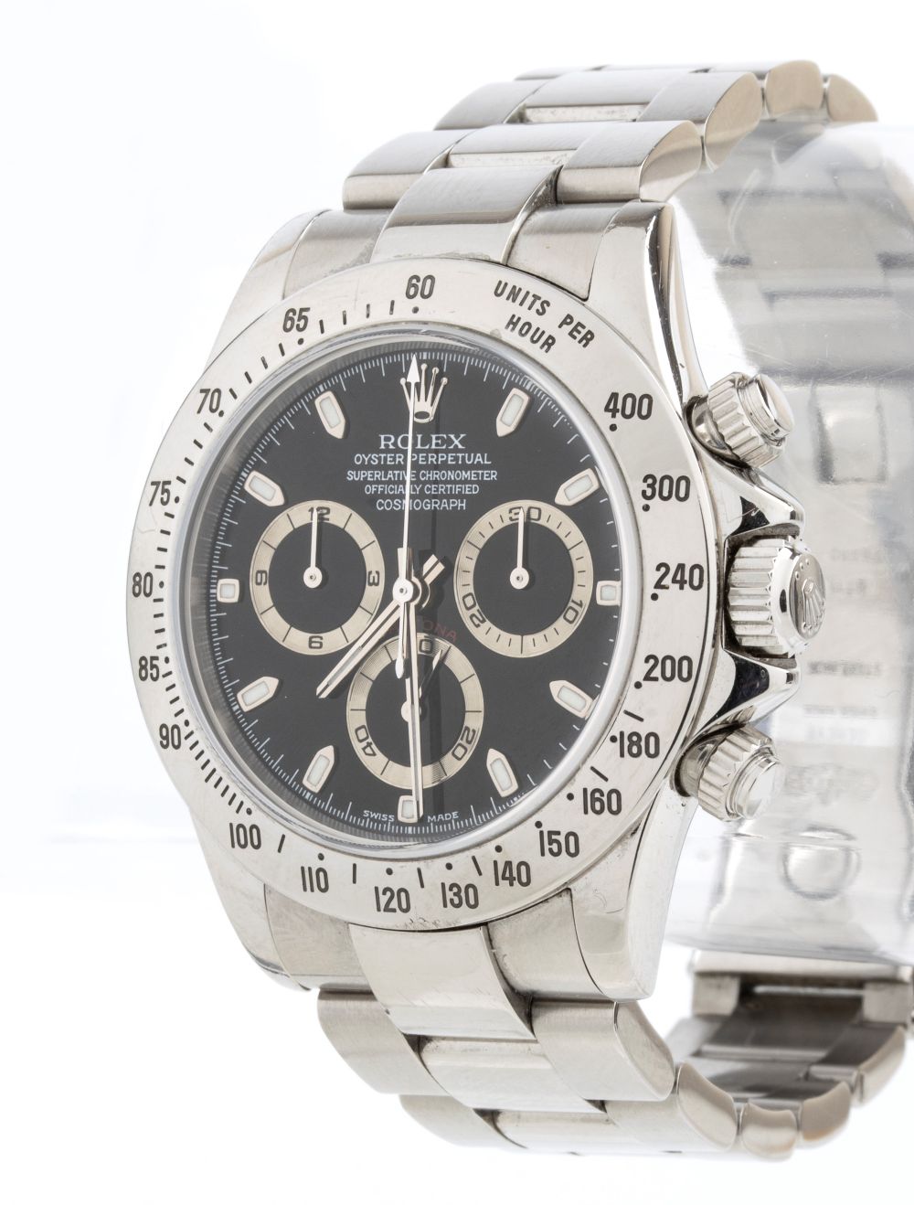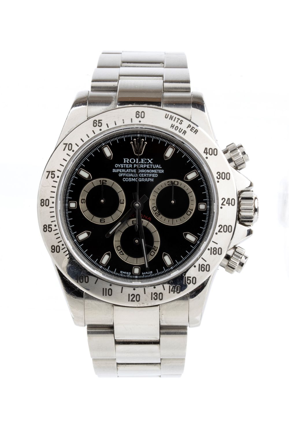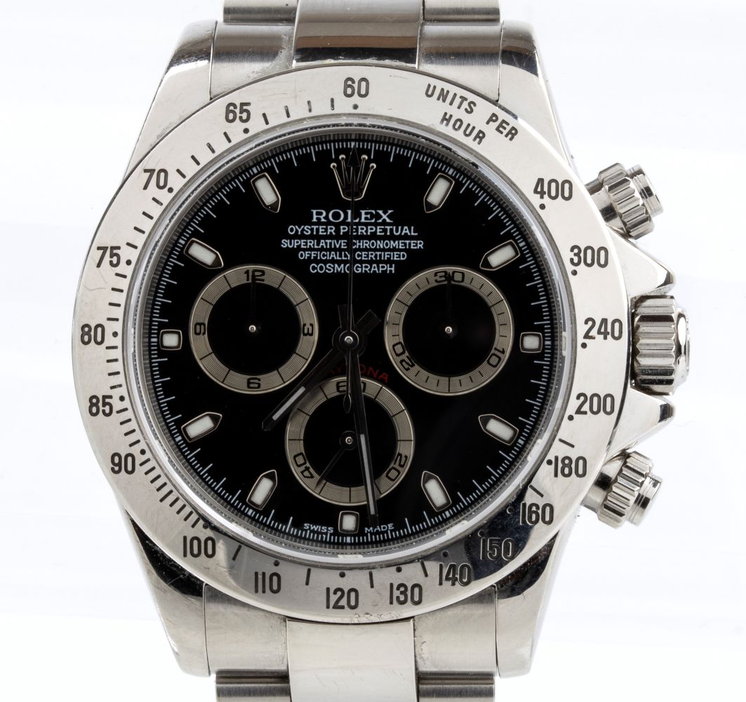 cassa e bracciale in acciaio, quadrante nero con indice e contatori in argento, movimento meccanico automatico. Referenza 116520, calibro 4130.