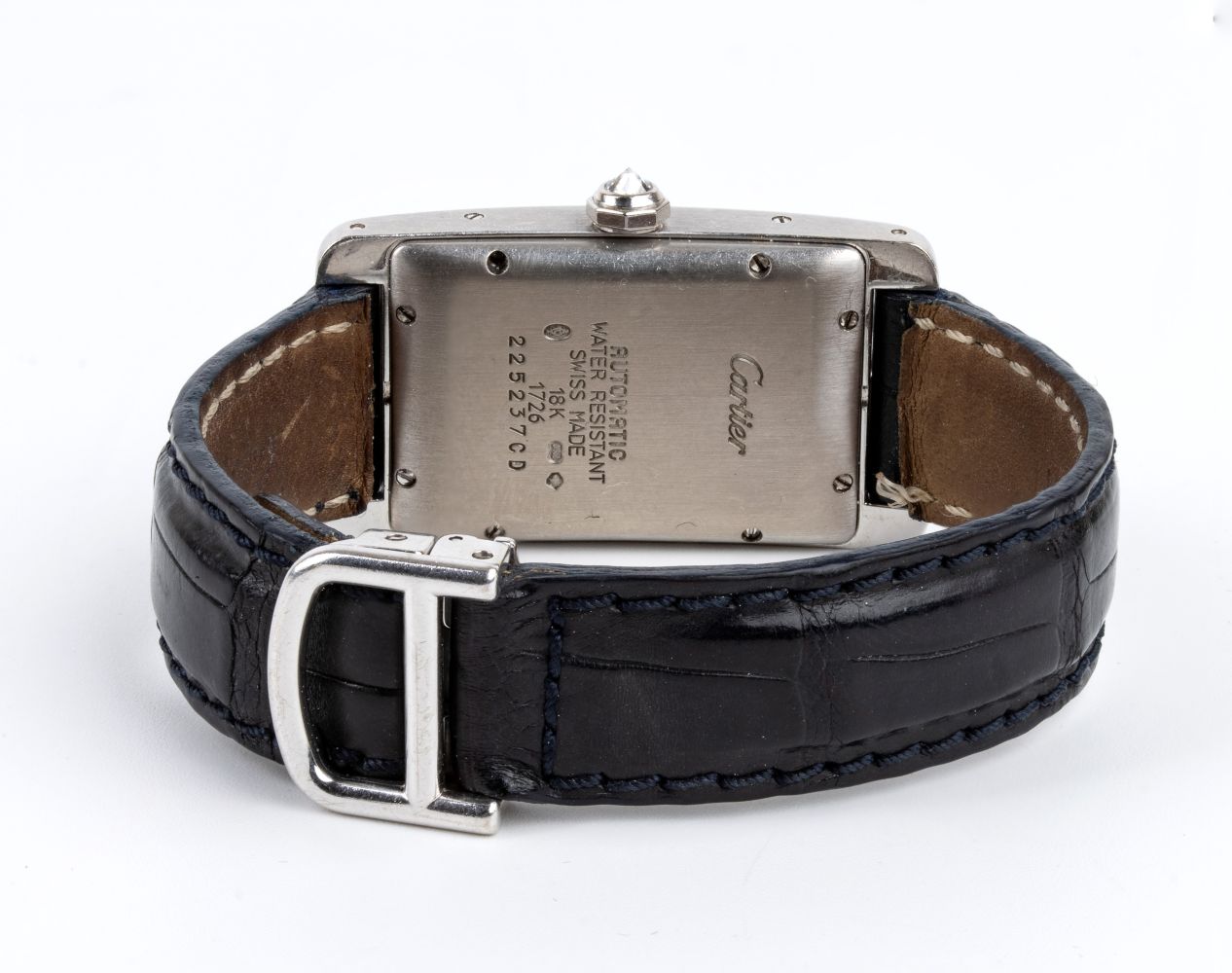 di recente produzione con cassa e fibbia deployante in oro bianco 18K, brillanti ai lati della cassa e corona di carica con diamante, con cinturino nero. Quadrante guilloché con indici romani, sfere a gladio color blu Cartier, datario ad ore 6. Referenza 1726, matricola 225237CD. Movimento meccanico a carica automatica.
