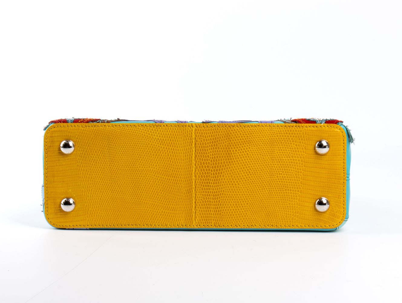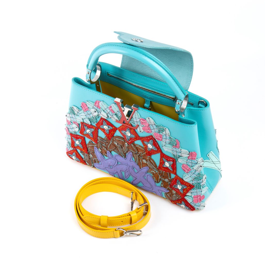 Louis Vuitton Arty Capucines Edizione Limitata Tschabalala 2019, realizzata in pelle di vitello e accenni di pelle di lucertola, la borsa presenta un manico superiore in pelle laminata con collegamenti stilizzati, il suo interno si presenta in pelle gialla.