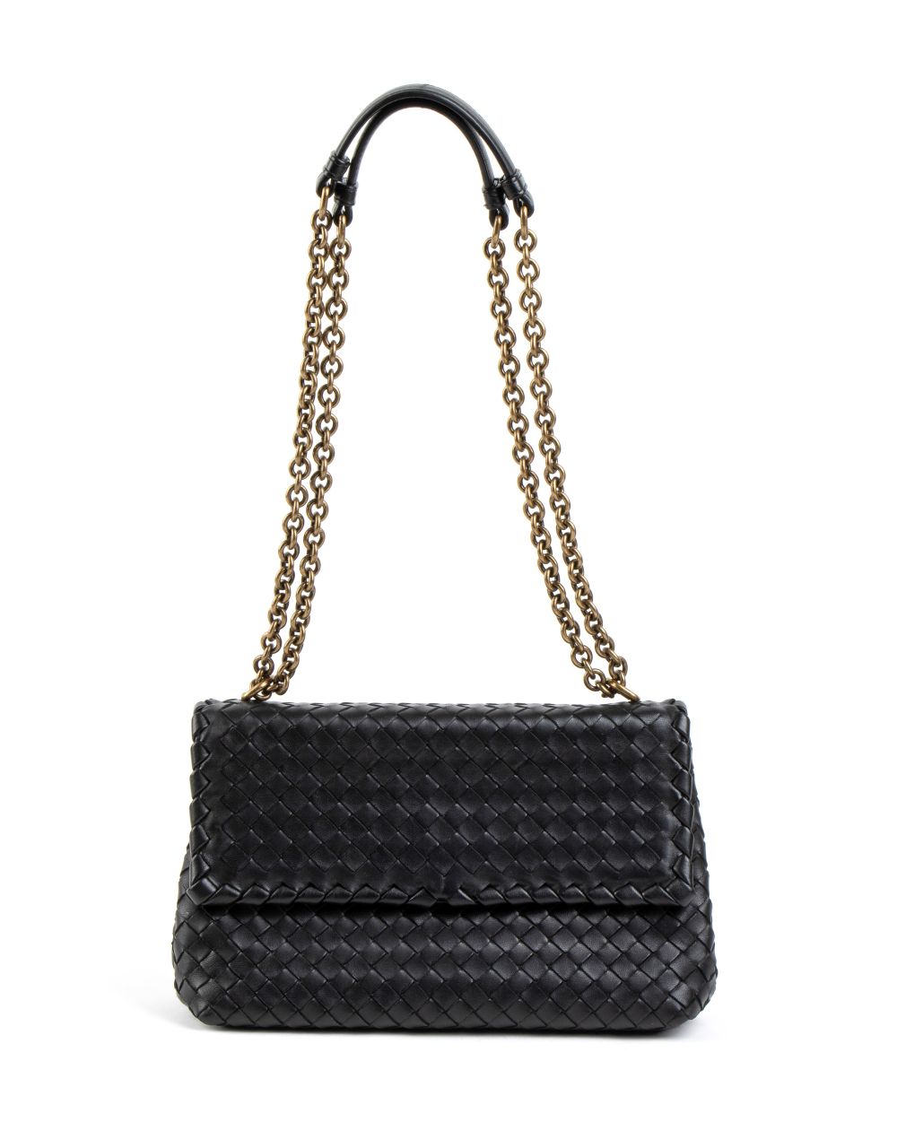 Borsa Bottega Veneta Olimpia in pelle intrecciata nera, inserti in metallo invecchiato, una tracolla a catena trasformabile in metallo invecchiato colore oro da portare a mano, spalla o a tracolla.