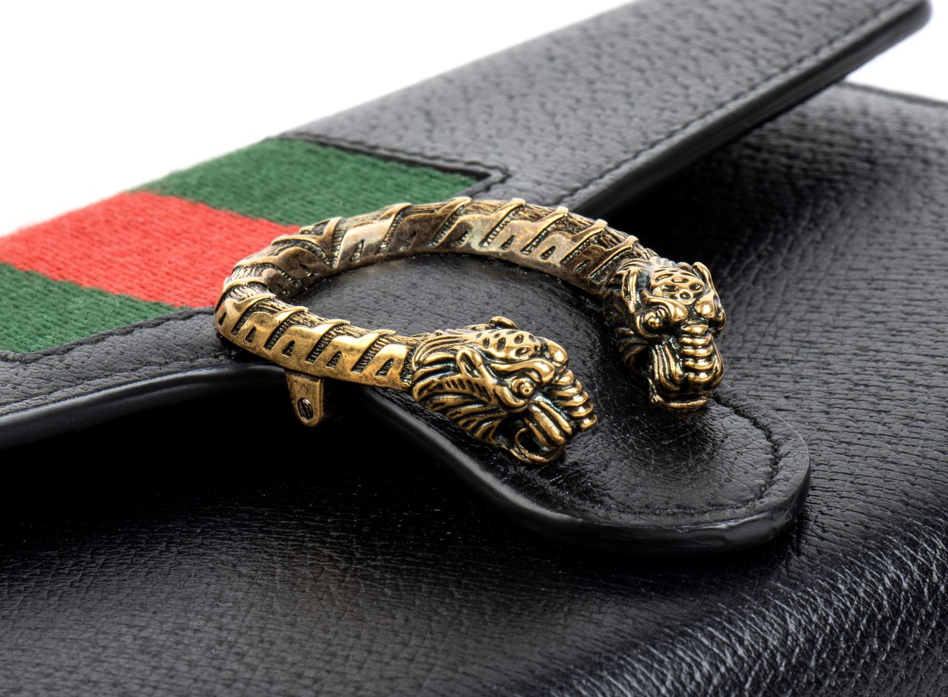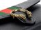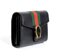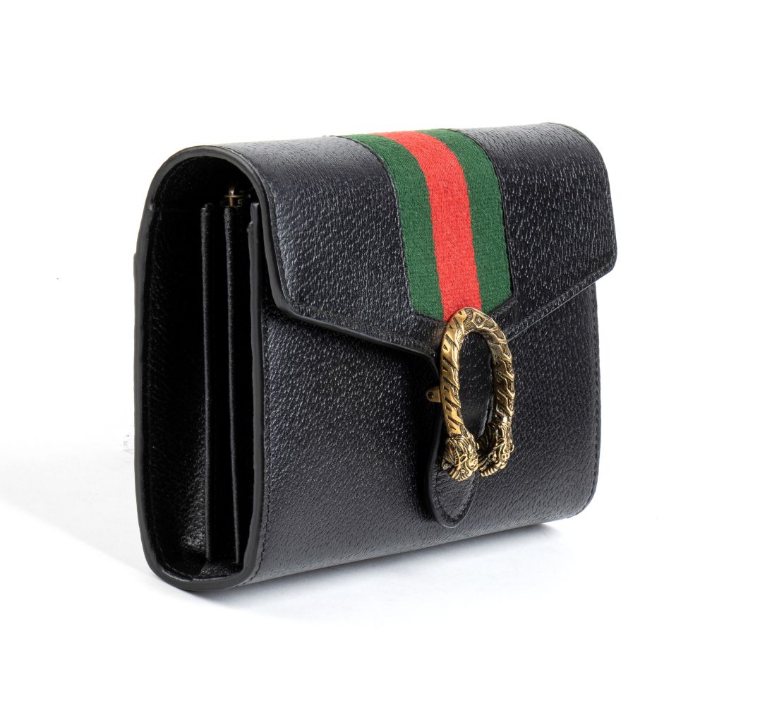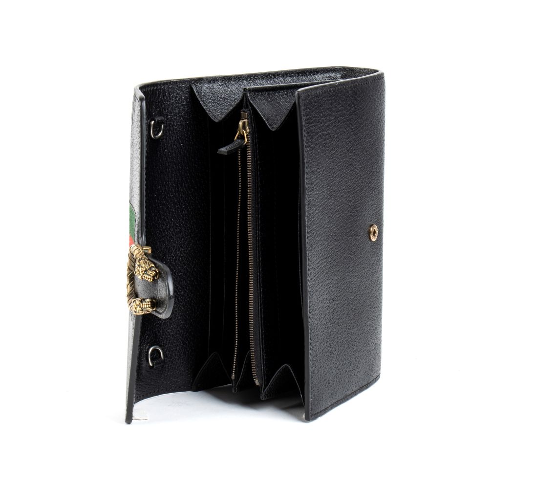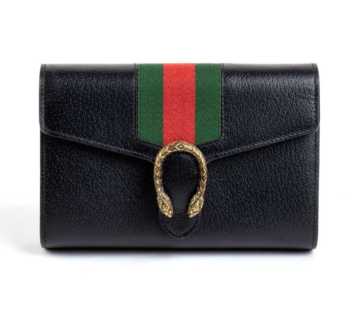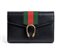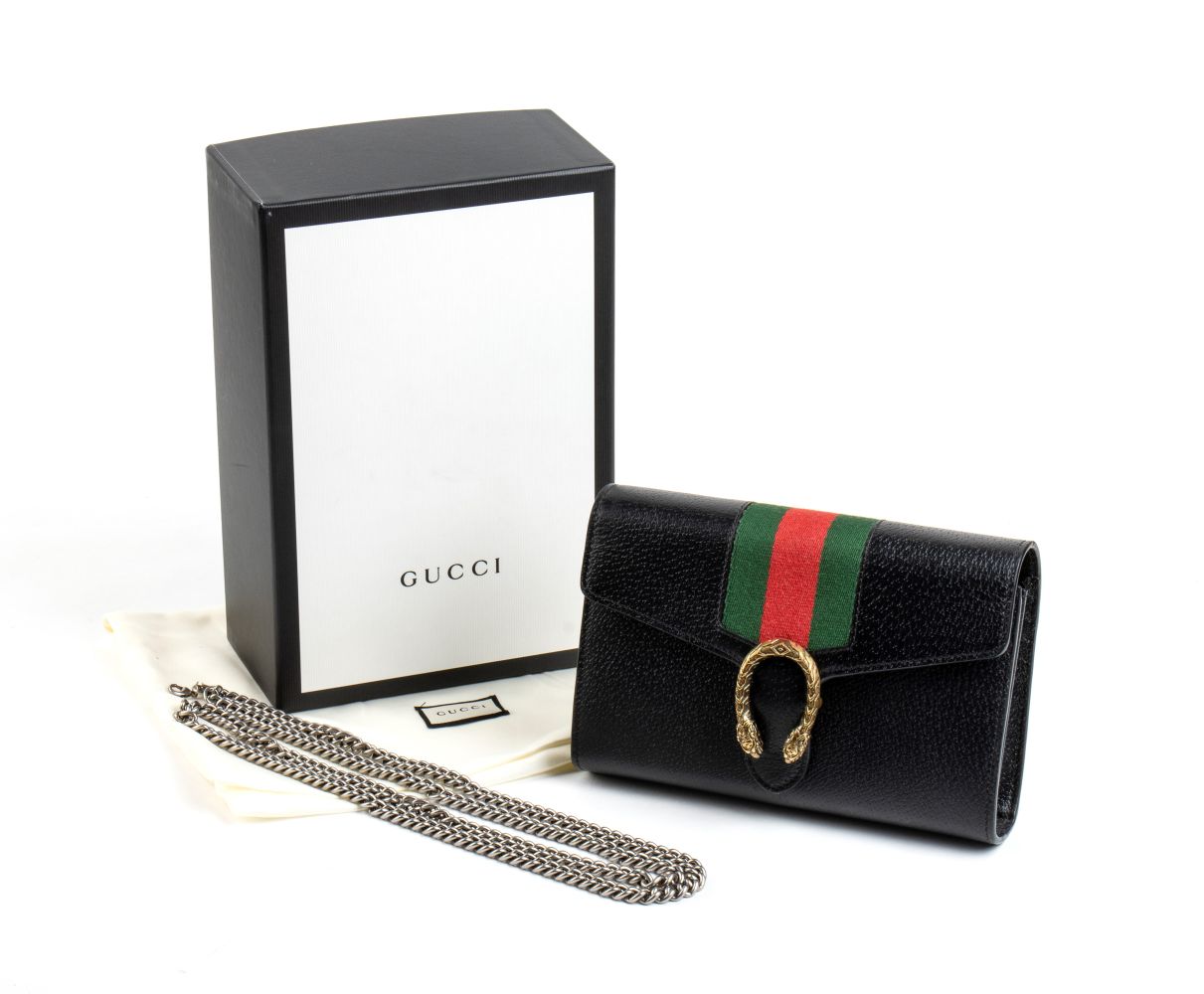 Borsa a spalla Dionysus in pelle nera con banda web verde e rossa, chiusura a testa di tigre metallica, tracolla a catena amovibile con possibilità di indossarla come pochette. 7549F 8402