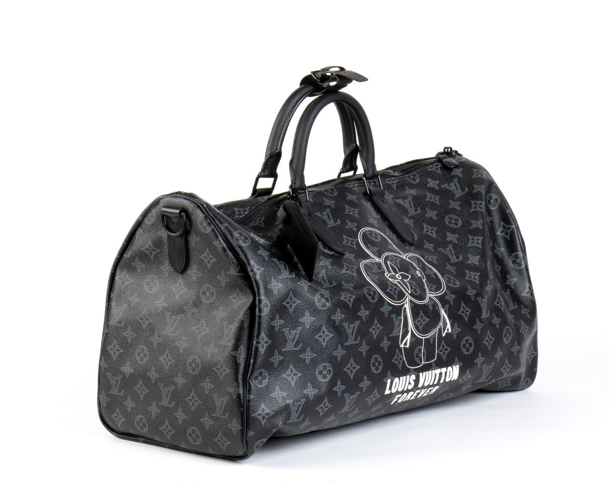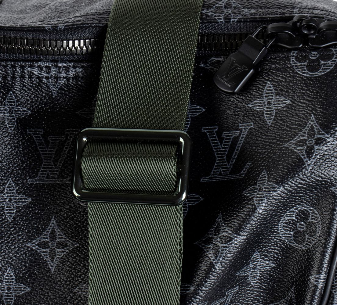 Louis Vuitton borsa da viaggio Keepall Vivienne Forever in Monogram Eclipse 50, dotata di tracolla rimovibile regolabile in tessuto verde correlato con l'interno.