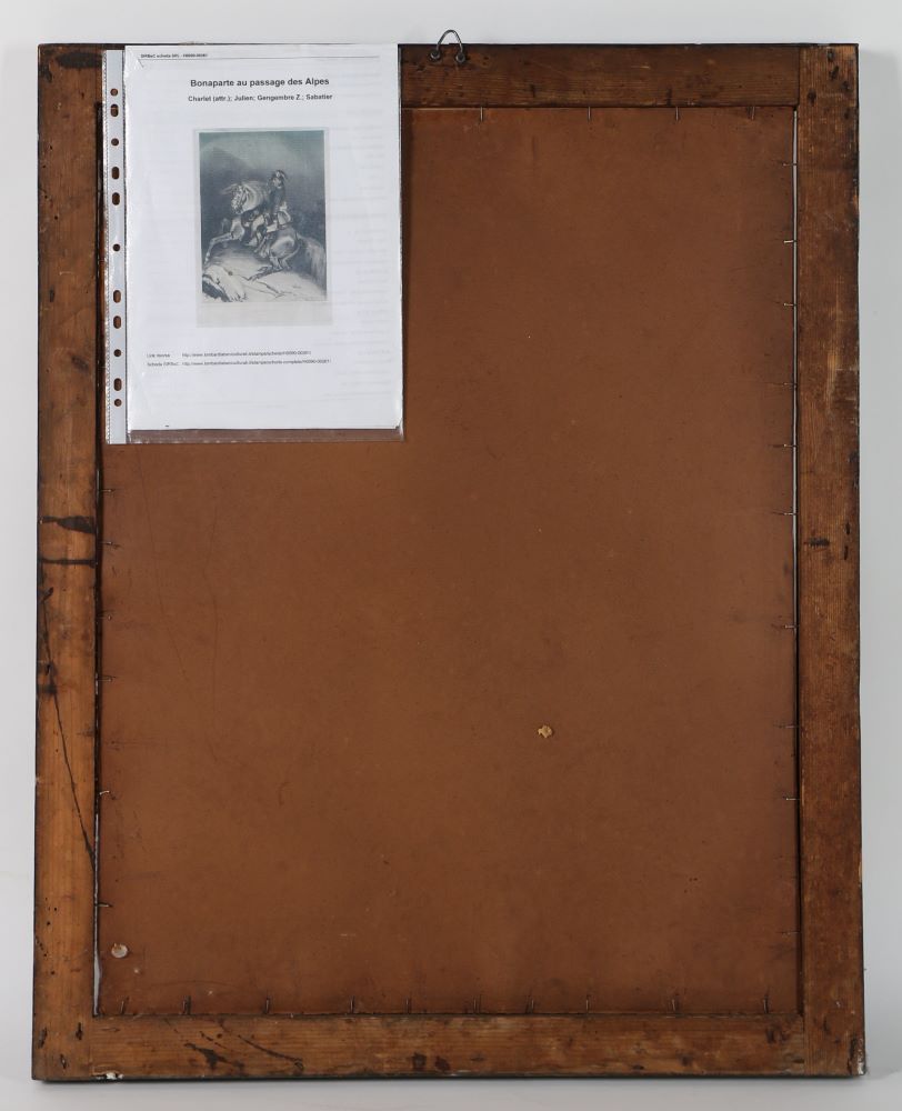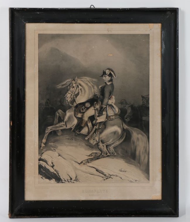 Nicolas Toussaint Charlet (Parigi 1792 - 1845) (attr.), Bonaparte au passage des Alpes, post 1844. Litografia a colori su carta. Litografi: Julien, Gengembre Z. e Sabatier. In basso a sinistra Lith. par Julien, Gengembre et Sabatier. In basso a destra Imprimè par Lemercier à Paris. In cornice con vetro. Lastra mm. 573x420.