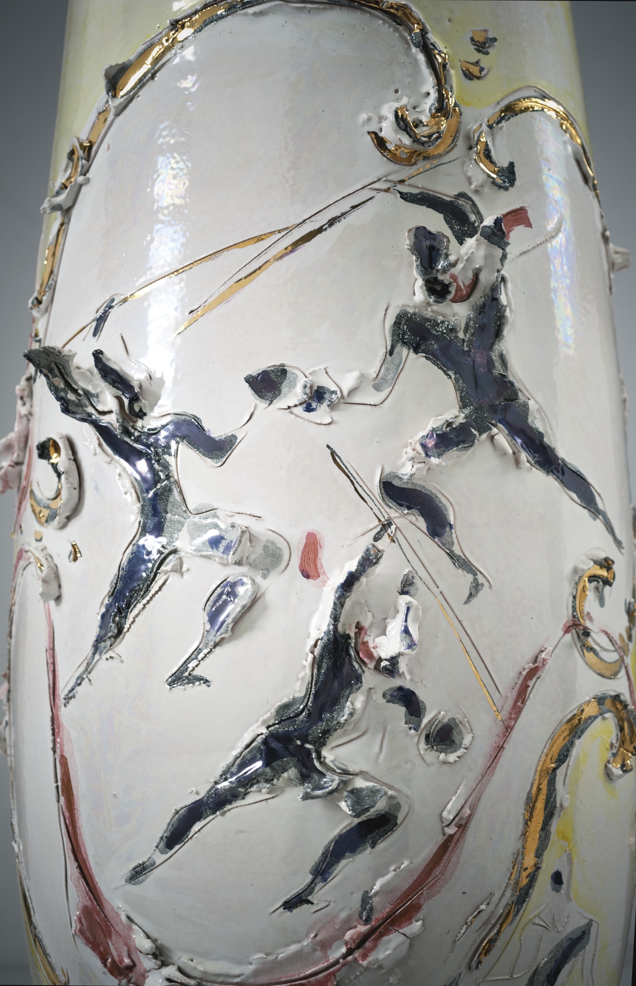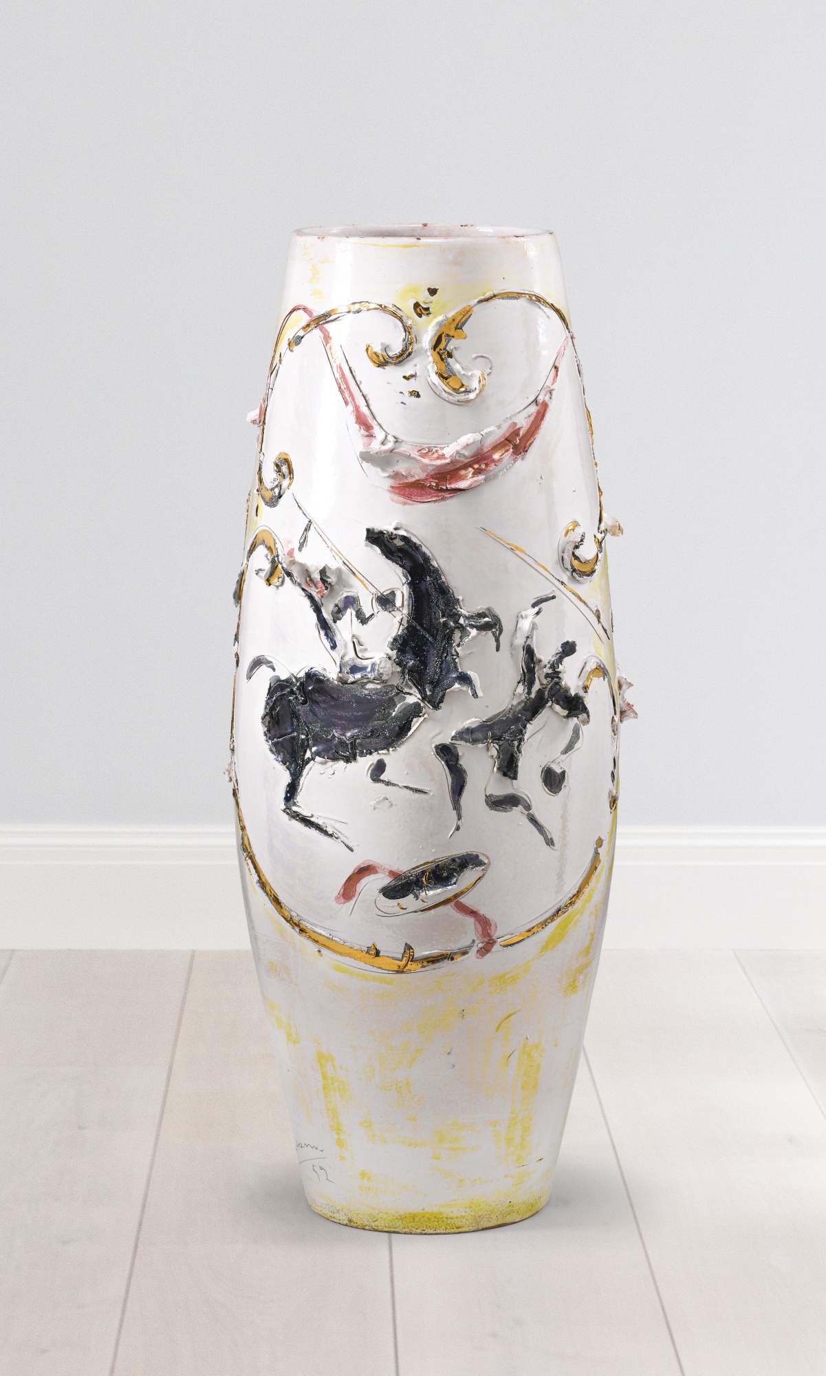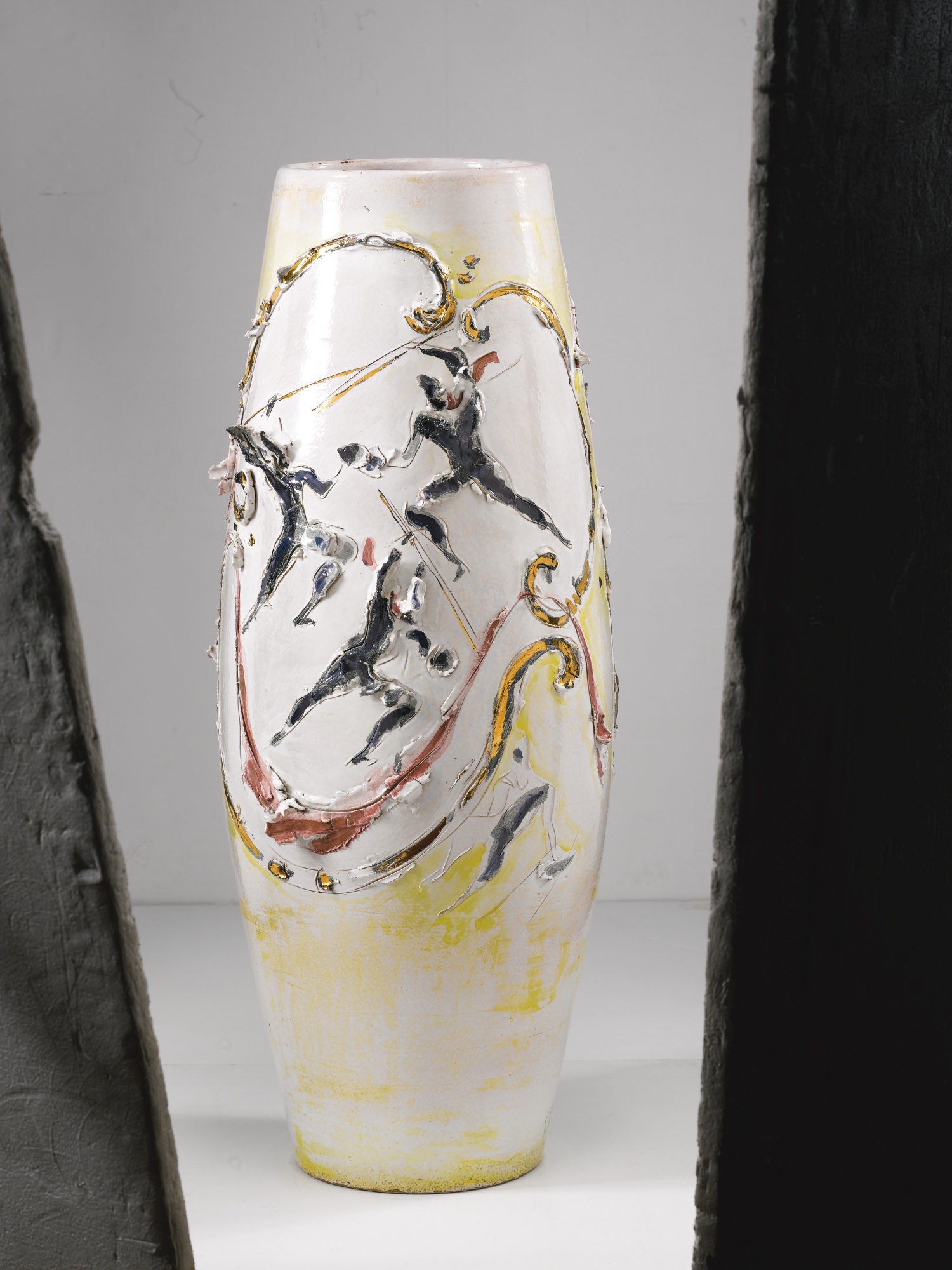 LUCIO FONTANA 1899 - 1968 BATTAGLIA signed and dated 52, glazed terracotta firmato e datato 52 terracotta smaltata cm 100x40 Opera registrata presso la Fondazione Lucio Fontana, Milano, con il n. 1900/246 L'opera è accompagnata da certificato su fotografia rilasciato dalla Fondazione Lucio Fontana, Milano PROVENANCE Acquistato dalla famiglia dell'attuale proprietario direttamente dall'artista CATALOGUE NOTE L'opera è accompagnata da attestato di libera circolazione