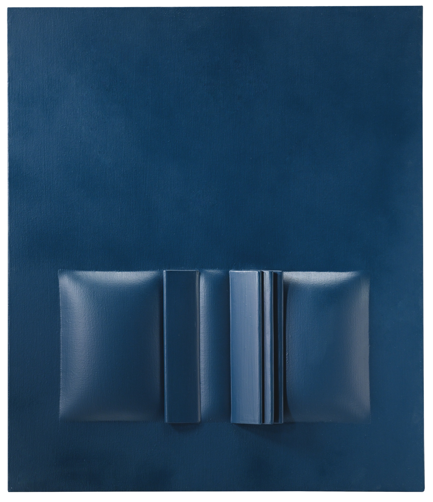 AGOSTINO BONALUMI 1935-2013 BLU signed on the reverse, shaped canvas and vynil tempera. Executed in 1964 firmato sul retro tela estroflessa e tempera vinilica cm 68x58 Eseguito nel 1964 Opera registrata presso l'Archivio Agostino Bonalumi, Milano, con il n. 64-064 L'opera è accompagnata da certificato su fotografia rilasciato dall'Archivio Agostino Bonalumi, Milano PROVENANCE Galleria Blu, Milano ivi acquistato dalla famiglia dell'attuale proprietario nel 1994