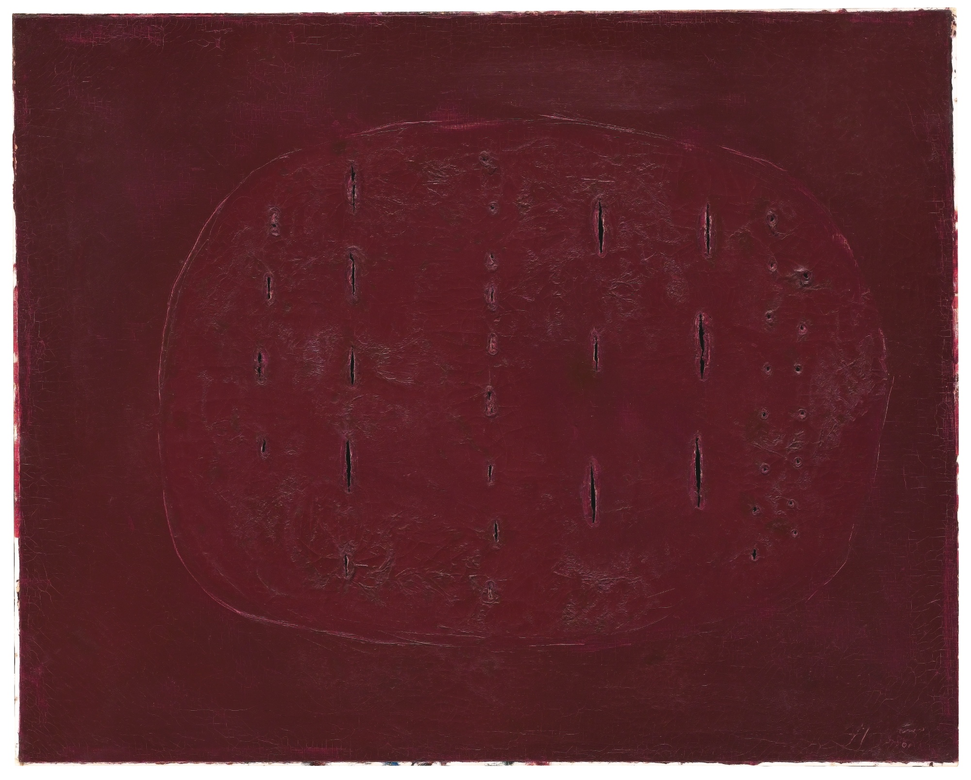 LUCIO FONTANA 1899 - 1968 CONCETTO SPAZIALE signed; signed, titled and dated 1960 on the reverse, oil, holes, cuts and graffiti on canvas firmato; firmato, intitolato e datato 1960 sul retro olio, buchi, tagli e graffiti su tela cm 80x100 PROVENANCE Galleria Blu, Milano Ivi acquistato dal padre dell'attuale proprietario nel primi anni Sessanta LITERATURE E. Crispolti, Lucio Fontana Catalogo ragionato di sculture, dipinti, ambientazioni, Milano 2006, n. 60 O 81, pag. 430, illustrato CATALOGUE NOTE "All'inizio degli anni Sessanta, Fontana si dedica con particolare impegno sopratutto al ciclo degli olii. Materia duttile, che permette di iscrivervi e affondarvi il segno del gesto che graffisce o del gesto che buca e lacera. I primi, ancora di per sé d'impianto linguistico informale, enunciano zone di materia a olio soltanto su una parte della tela...(...) quindi Fontana cerca di definire delle 'forme' materiche con l'olio, mimando persino le pietre, oppure cercando di definire grandi forme come anni prima in certi gessi". (Enrico Crispolti, Catalogo Ragionato, Milano 2006, p. 72) L'opera è in temporanea importazione artistica. This lot is in artistic importation licence.
