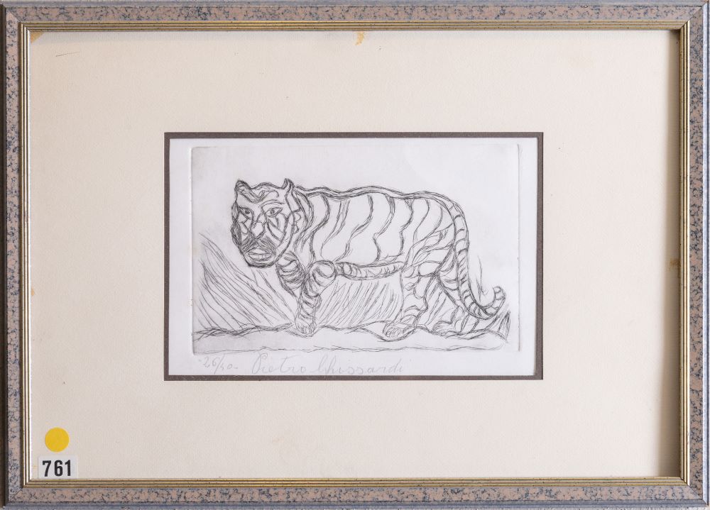Pietro Ghizzardi (Viadana 1906 - Boretto 1986). Tigre che cammina. Cm 16x24,5 (lastra). Cm 35x50 (foglio). In cornice cm 38,5x54. Incisione su carta. Numerata e firmata a matita in basso a sinistra 26/40 Pietro Ghizzardi. In cornice con vetro.