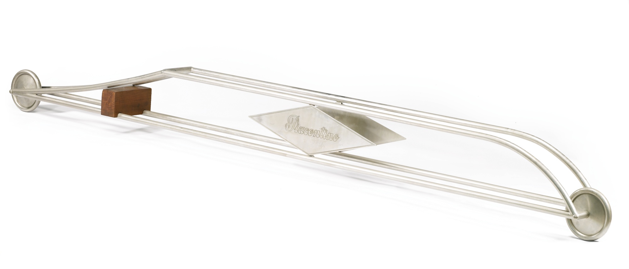 GIANNI PIACENTINO N. 1945 MONO NICKEL VEHICLE II (RHOMBOID PLATES) Nickel-plated iron tube, brass and bronze, mahogany stand. Executed in 1971 nickel, ottone, bronzo, base in mogano cm 35x318x18,5 assembalto in 5 pezzi, ruote diam 19,5 Eseguito nel 1971 Catalogo generale di Gianni Piacentino, www.giannipiacentino.com, n. 164, illustrato PROVENANCE Acquistato direttamente dall'artista nel 1971 circa