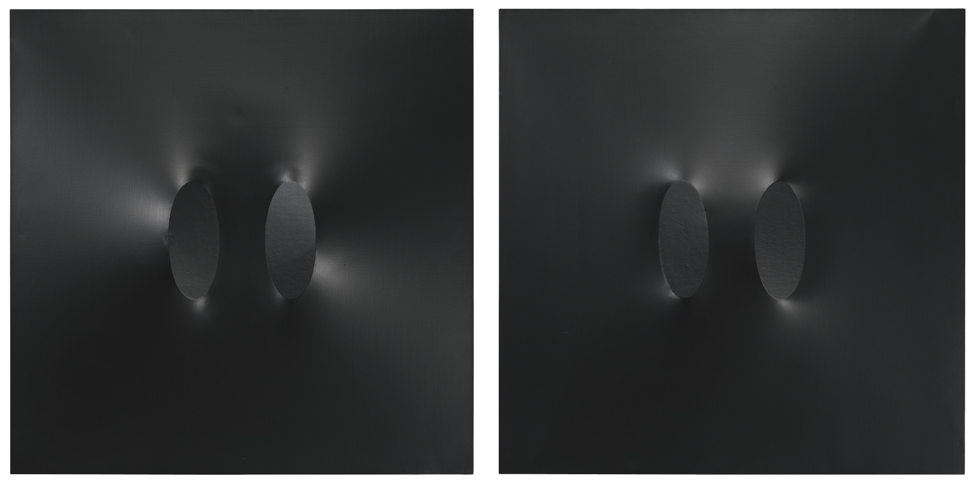 TURI SIMETI N. 1929 SENZA TITOLO signed and dated 1967 on the reverse, oil on shaped canvas, a dypthic firmato e datato 1967 sul retro olio su tela estroflessa, dittico cm 100x100x13 ciascuno Opera registrata presso l'Archivio Turi Simeti, a cura della Galleria Dep Art, Milano, con il n. 1967-N1001 L'opera è accompagnata da certificato su fotografia rilasciato dall'Archivio Turi Simeti, a cura della Galleria Dep Art, Milano PROVENANCE Acquistato dall'attuale proprietario direttamente dall'artista nel 1967 circa EXHIBITED Modigliana, Fondazione Cesare Castelli, IX Premio Nazionale di Pittura Silvestro Lega, 1967
