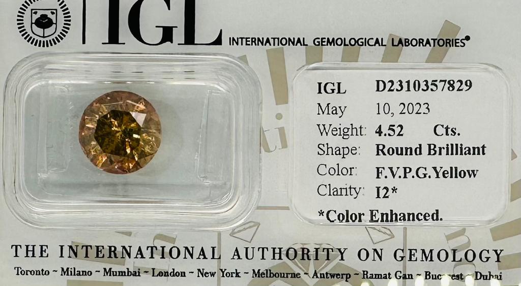 DIAMANTE 4,52 CT GIALLO VERDOGNOLO ROSATO* VIVIDO I2* (COLORE E ESALTATI) - C30503