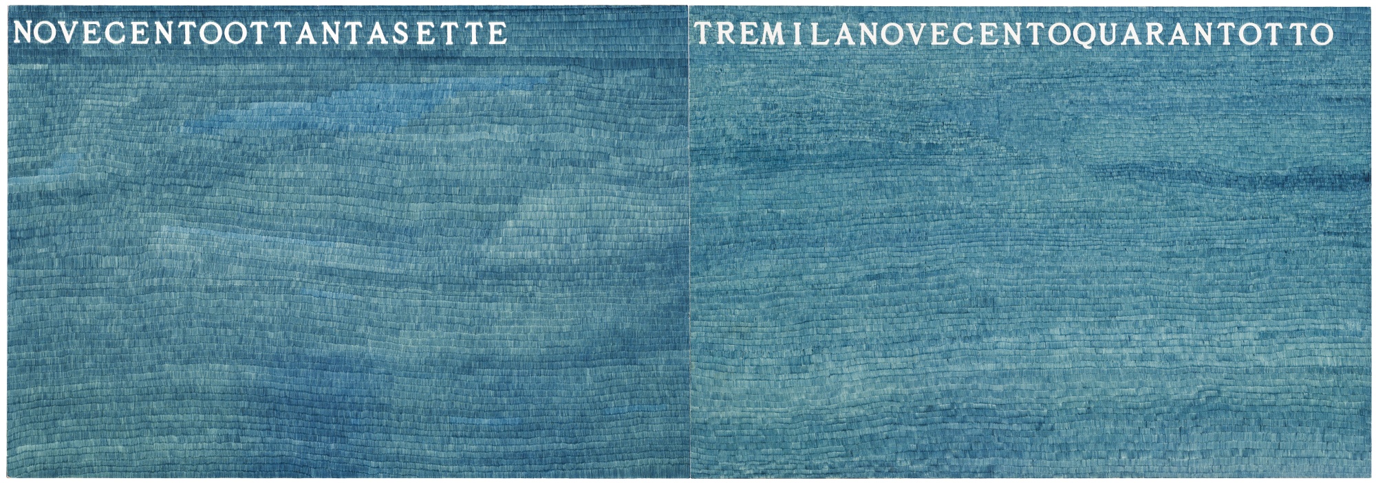 ALIGHIERO BOETTI 1940 - 1994 LA METÀ E IL DOPPIO penball on paper (two elements). Executed in 1974 biro su carta cm 70x200 (in due parti) Eseguito nel 1974 Opera registrata presso l'Archivio Alighiero Boetti, Roma, con il numero 7711 L'opera è accompagnata da certificato su fotografia rilasciato dall'Archivio Alighiero Boetti, Roma PROVENANCE Galleria Galatea, Torino Ivi acquistato dalla famiglia dell'attuale proprietario alla fine degli anni Settanta CATALOGUE NOTE "La scritta bianca sembra fluttuare sullo sfondo tratteggiato in blu e articola per così dire la lingua in forma scritta in uno spazio immaginario. Boetti mostra qui la lingua come mezzo che, paragonabile alla musica , riempie gli spazi tra le persone con parole e contenuti. Gli spazi interpersonali diventano così spazi di dialogo, di comunicazione, di scambio di idee. Scrittura e lingua sono le basi semantiche della nostra comunicazione sociale e le nuove generazioni devono esserne sempre rese coscienti. Così, attraverso i lavori biro, nasce nell'osservatore un'idea complessa della realtà della lingua e delle immagini che vengono evocate da questa lingua sulla base di un semplice ordine composto dalle lettere." (Rolf Lauter, I Gruppi di lavoro, catalogo della mostra Alighiero Boetti Mettere al mondo il mondo, Francoforte 1998, p. 49)