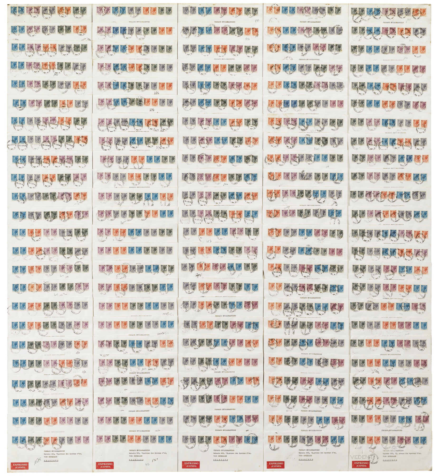 ALIGHIERO BOETTI 1940 - 1994 LAVORO POSTALE (PERMUTAZIONE) envelops with 10 Italian stamps each and ink. Executed in 1972 120 buste affrancate con 10 francobilli italiani ciascuna e timbrate cm 125,5x113 Eseguito nel 1972 Opera registrata presso l'Archivio Alighiero Boetti, Roma, con il n. 7712 L'opera è accompagnata dal certificato su fotografia rilasciato dall'Archivio Alighiero Boetti, Roma PROVENANCE Galleria Galatea, Torino Ivi acquistato dall'attuale proprietario alla fine degli anni Settanta
