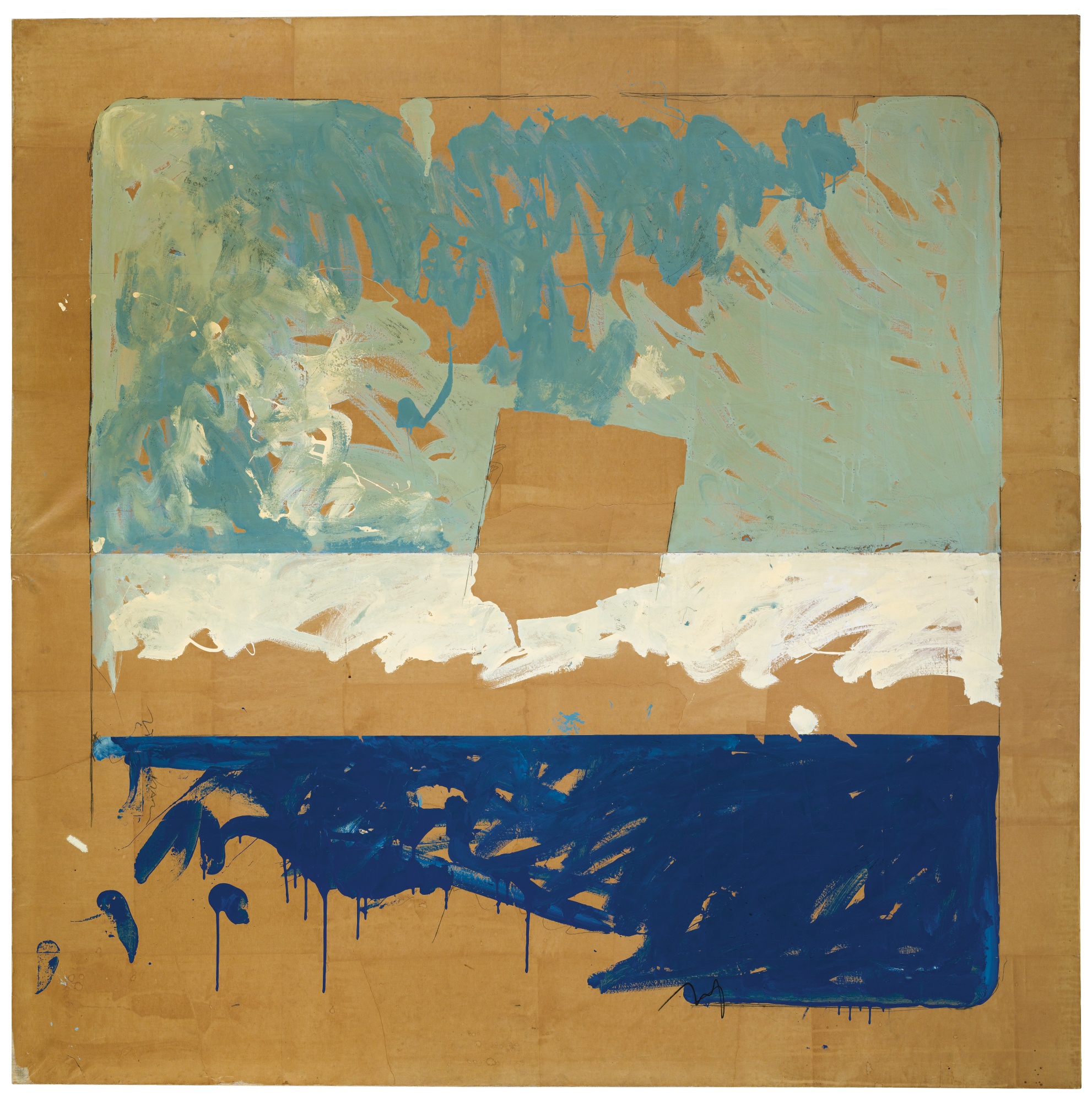 MARIO SCHIFANO 1934 - 1998 AL MARE titled; signed and titled on the reverse, chalck and enamel on paper laid on canvas. Executed in 1963 intitolato; firmato e intitolato sul retro carboncino e smalto su carta applicata su tela cm 200x200 (dittico) Eseguito nel 1963 Opera registrata presso l'Archivio Mario Schifano, Roma, con il n. 00277061113 L'opera è accompagnata da certificato su fotografia rilasciato dall'Archivio Mario Schifano, Roma PROVENANCE Collezione Privata, Gallarate (acquistato alla fine degli anni Settanta) Acquistato dall'attuale proprietario nel 2006 CATALOGUE NOTE L'attestato di libera circolazione è stato richiesto per questo lotto An export licence has been requested for this lot "Ampio, insoluto", cioè approssimativo, cosi Schifano definisce il suo lavoro. L'approssimazione è quella di forme ambigue, quelle assunte dalla memoria, quelle tracciate dalla mano imprecisa e sicura al tempo stesso, elegante e imperfetta, felicemente inesatta. [...] Approssimativo è anche il Mare (1963), con quei tocchi di onde azzurre accennate: "Per me la luce, il mare sono sempre stati molto importanti." (Laura Cherubini, Elogio dell'approssimazione, in catalogo della mostra, Fondazione Marconi, Schifano. 1960-1964. Dal monoscromo alla strada, Milano 2005, pag. 192)