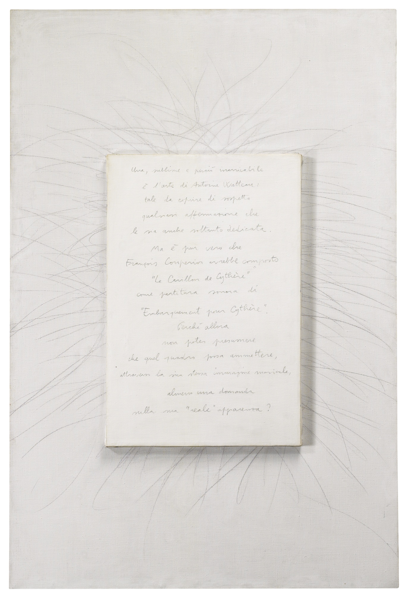 GIULIO PAOLINI N. 1940 UNA VISIONE signed, titled and dated 1973 on the reverse, pencil on prepared canvas firmato, intitolato e datato 1973 sul retro matita su tela preparata cm 120x80 PROVENANCE Galleria Notizie, Torino Ivi acquistato dall'attuale proprietario LITERATURE Maddalena Disch, Giulio Paolini Catalogo ragionato, 1960-1999, Milano 2008, n. 254, p. 266, illustrato CATALOGUE NOTE Una tela preparata che reca un testo dell'artista scritto a matita, è montata al centro di una tela più grande, in modo da nascondere il presunto disegno del quale restano visibili solo i segni marginali. Lo scritto recita: "Una, sublime e perciò inarrivabile è l'arte di Antoine Watteu: tale da coprire di sospetto qualsiasi affermazione che le sia anche soltanto dedicata. Ma è pur vero che François Couperin avrebbe composto Le Carillon de Cythère come partita sonora di Embarquement pour Cythère. Perché allora non poter presumere che quel quadro possa ammettere, attraverso la sua stessa immagine musicale, almeno una domanda sulla 'reale' apparenza?" (Maddalena Dish, dal catalogo ragionato)