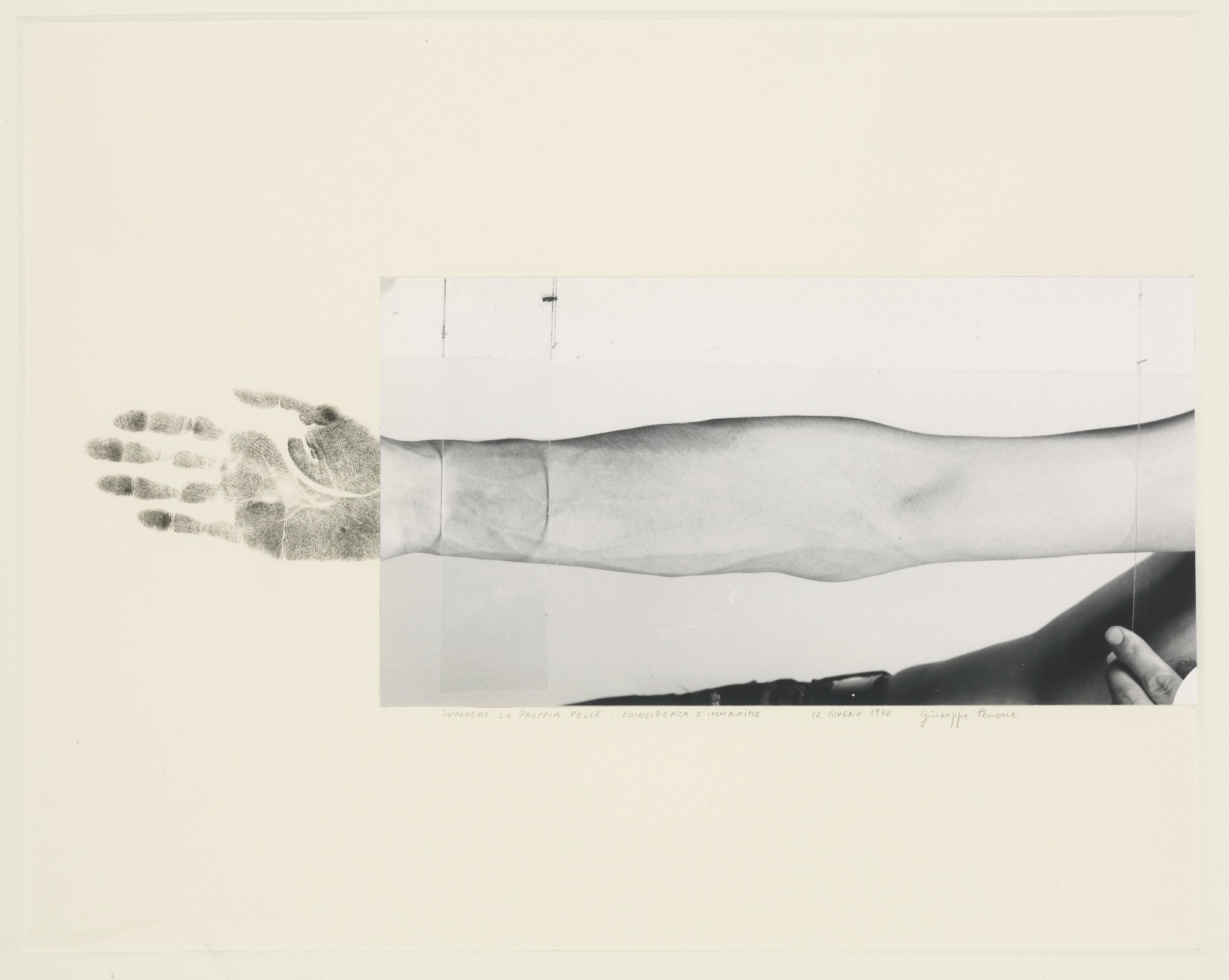 GIUSEPPE PENONE N. 1947 SVOLGERE LA PROPRIA PELLE, COINCIDENZA DI IMMAGINE signed, titled and dated 12 Giugno 1970, photograph, ink on paper firmato, intitolato e datato 12 Giugno 1970 fotografia e inchiostro su carta cm 54,5x70 PROVENANCE Tucci Russo, Torino Ivi acquistato dall'attuale proprietario nel 2010 CATALOGUE NOTE "Penone propone una dettagliata e sistematica lettura fotografica del proprio corpo. La riflessione, che verte come in molti suoi lavori, sul rapporto tra l'individuo vivente e l'ambiente esterno che lo circonda e lo accoglie, individua nell'epidermide umana, la superficie corporale dell'io, che diventa linea di confine tra ciò che è dentro e ciò che è fuori, ma è anche trait d'union che, grazie ai suoi organi sensori, mette in reciproco dialogo il corpo e l'ambiente." (Franco Mello, Giuseppe Penone, Svolgere la propria pelle, Torino, 1971)