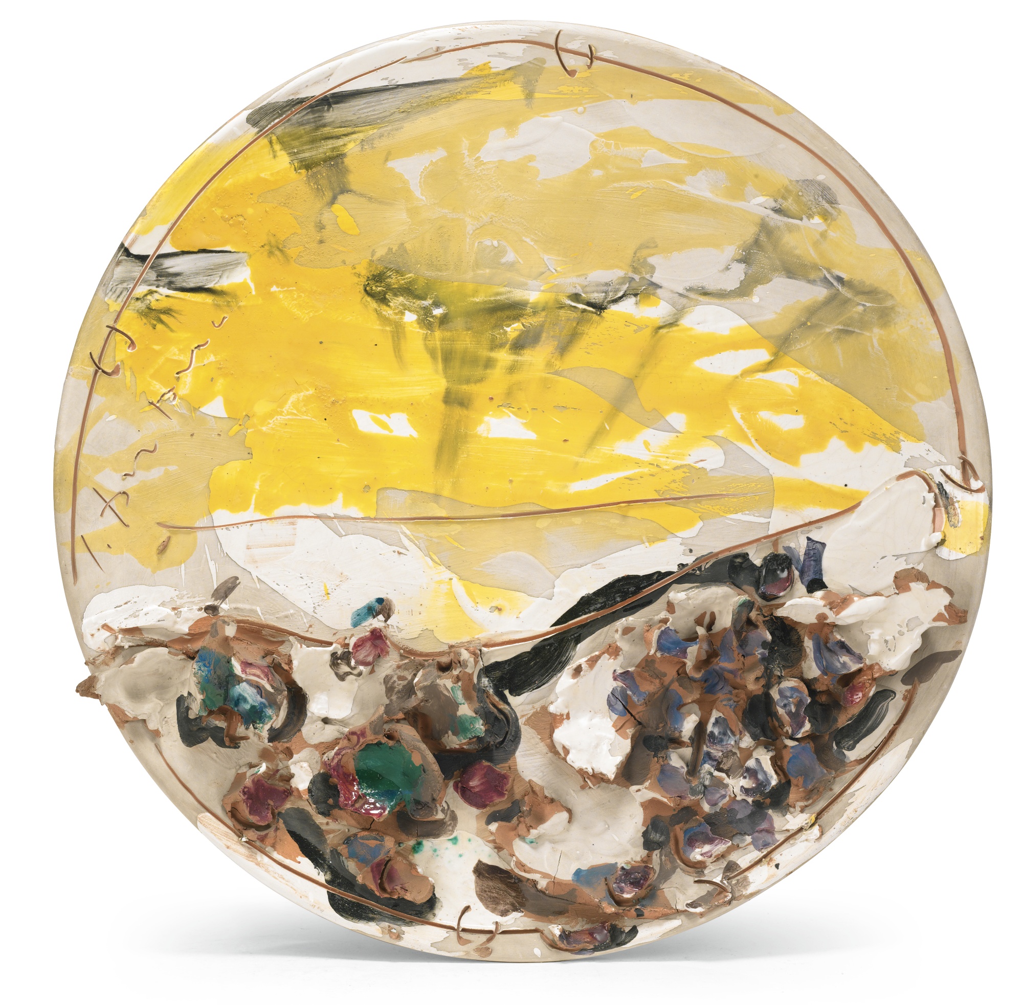 LUCIO FONTANA 1899 - 1968 SENZA TITOLO signed, glazed terracotta. Executed in 1950-52 firmato terracotta smaltata diam. cm 40 Eseguito nel 1950-52 Opera registrata presso la Fondazione Lucio Fontana, Milano, con il n. 1900/247 L'opera è accompagnata da certificato su fotografia rilasciato dalla Fondazione Lucio Fontana, Milano PROVENANCE Acquistato dalla famiglia dell'attuale proprietario direttamente dall'artista CATALOGUE NOTE L'opera è accompagnata da attestato di libera circolazione An export licence is available for this lot