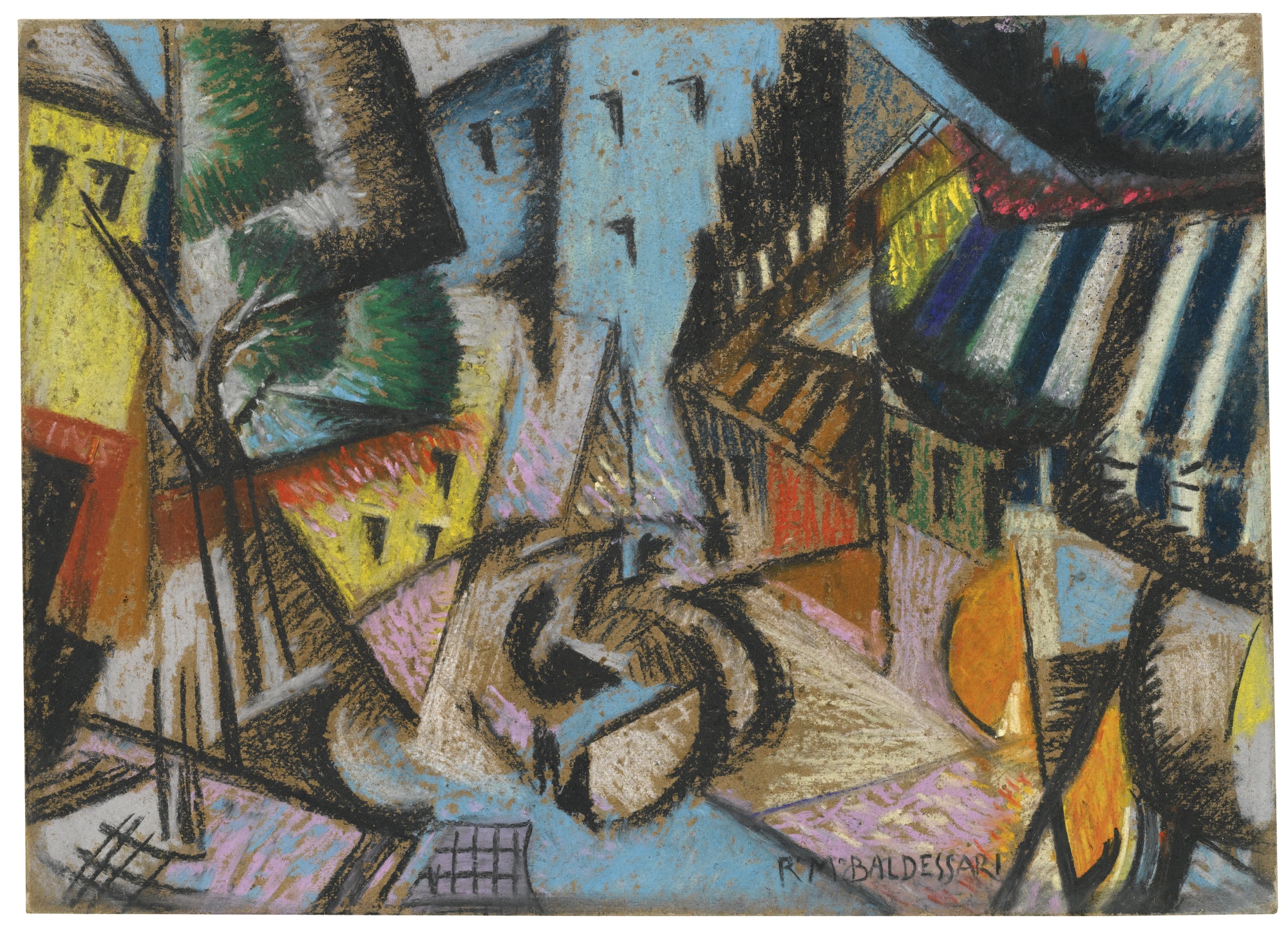 ROBERTO MARCELLO BALDESSARI 1894-1965 LA PIAZZA signed, pastels and chalck on paper. Executed in 1919 firmato pastelli e carboncino su carta cm 24,7x34 Eseguito nel 1919 Opera registrata presso l'Archivio Roberto Marcello Baldessari, a cura di Maurizio Scudiero, Rovereto, con il n. B 19- 63 L'opera è accompagnata da certificato rilasciato dall'Archivio Roberto Marcello Baldessari, a cura di Maurizio Scudiero, Rovereto PROVENANCE Collezione Esterina Marchesini, Padova Galleria Fonte d'Abisso, Milano Galleria Arte Centro, Milano Ivi acquistato dall'attuale prpoprietario EXHIBITED Milano, Galleria Fonte d’Abisso Arte, R.M. Baldessari. Opere futuriste,1997 LITERATURE M. Scudiero, Catalogo ragionato delle opere futuriste di R.M. Baldessari, Volume 2° (1914-1937), Trento1996, pp. 88-89, illustrato a colori CATALOGUE NOTE L'attestato di libera circolazione è stato richiesto per questo lotto An export licence has been requested for this lot
