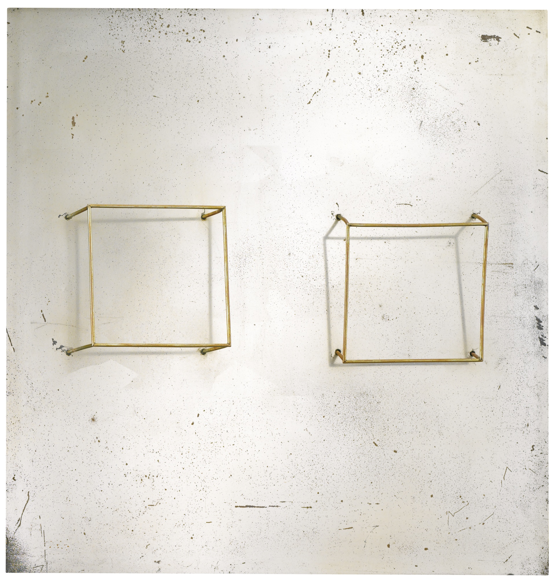 GIANNI COLOMBO 1937-1993 SPAZIO ELASTICO 2 CUBI signed on the reverse, aluminium and electric engine. Executed in 1967 firmato sul retro alluminio e motorino elettrico cm 54,5x52,5x13,5 Eseguito nel 1967 Opera registrata presso l'Archivio Gianni Colombo, Milano, con il n.1238 L'opera è accompagnata da certificato su fotografia rilasciato dall'Archivio Gianni Colombo, Milano PROVENANCE Galleria dell'Annunciata, Milano Studio Casoli, Milano EXHIBITED Milano, Studio Casoli, Gianni Colombo, 2002