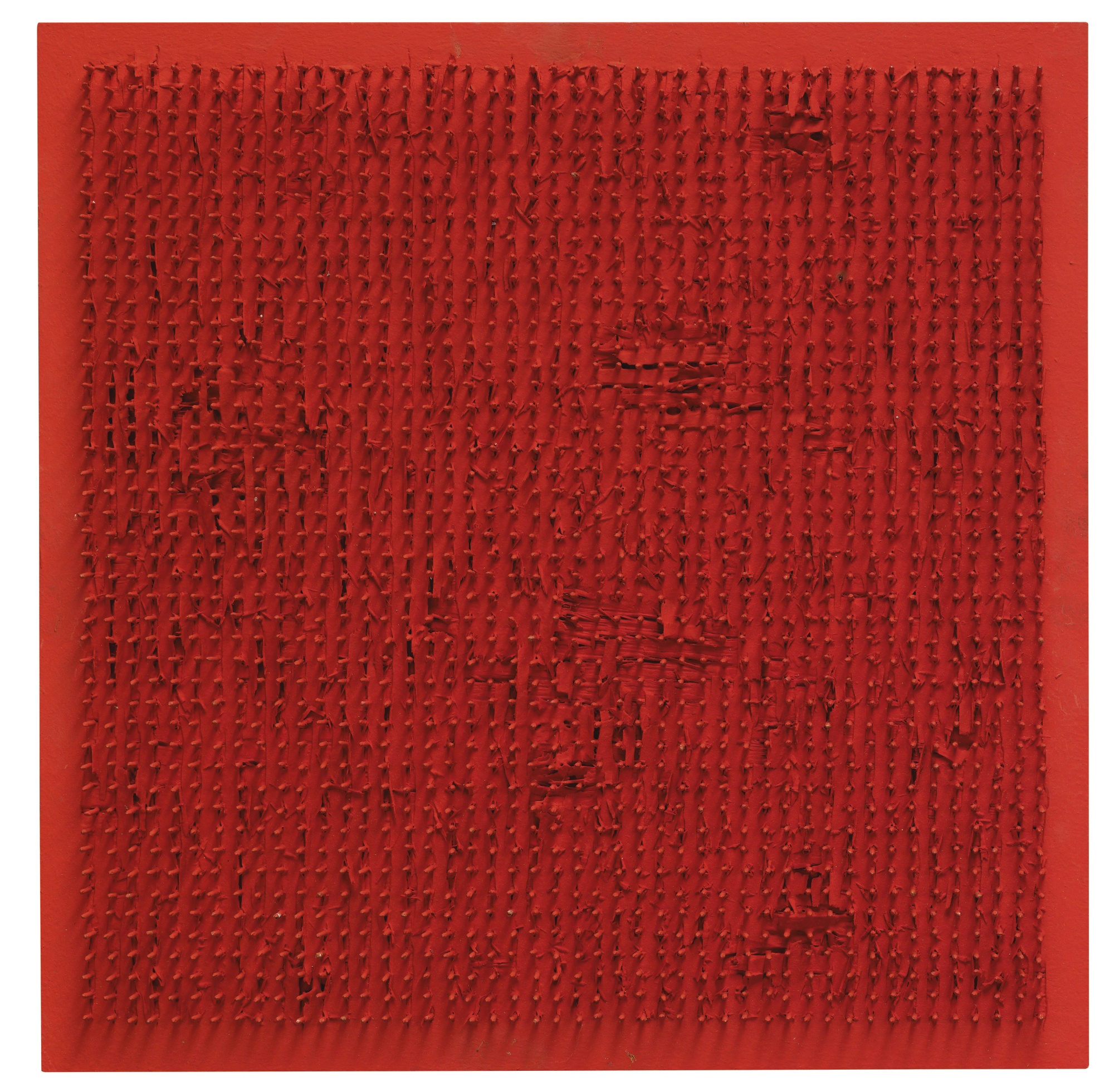 BERNARD AUBERTIN 1934 TABLEAU CLOUS signed and dated 1969 on the stretcher, nails and acrylic on panel firmato e datato 1969 sul retro chiodi e acrilico su tavola cm 50x50 Opera registrata presso l'Archivio Opere Bernard Aubertin, Milano L'opera è accompagnata da certificato su fotografia rilasciato dall'Archivio Opere Bernard Aubertin, Milano
