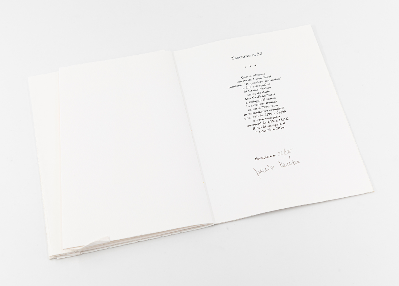 Edizione d'arte, curata da Diego Torri, realizzata su carta Tintoretto e recante due 'extrapagine' di Grazia Varisco, ciascuna recante firma a matita al fronte