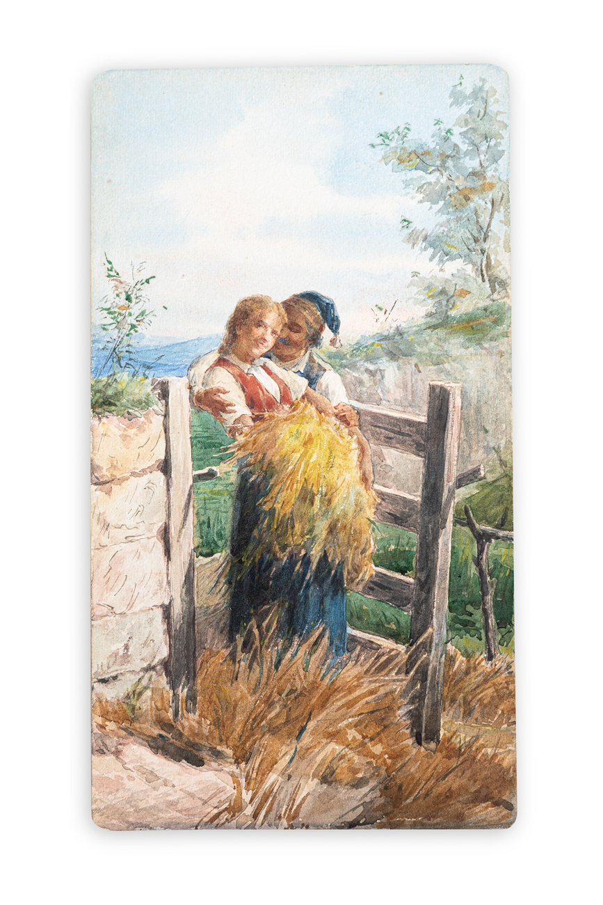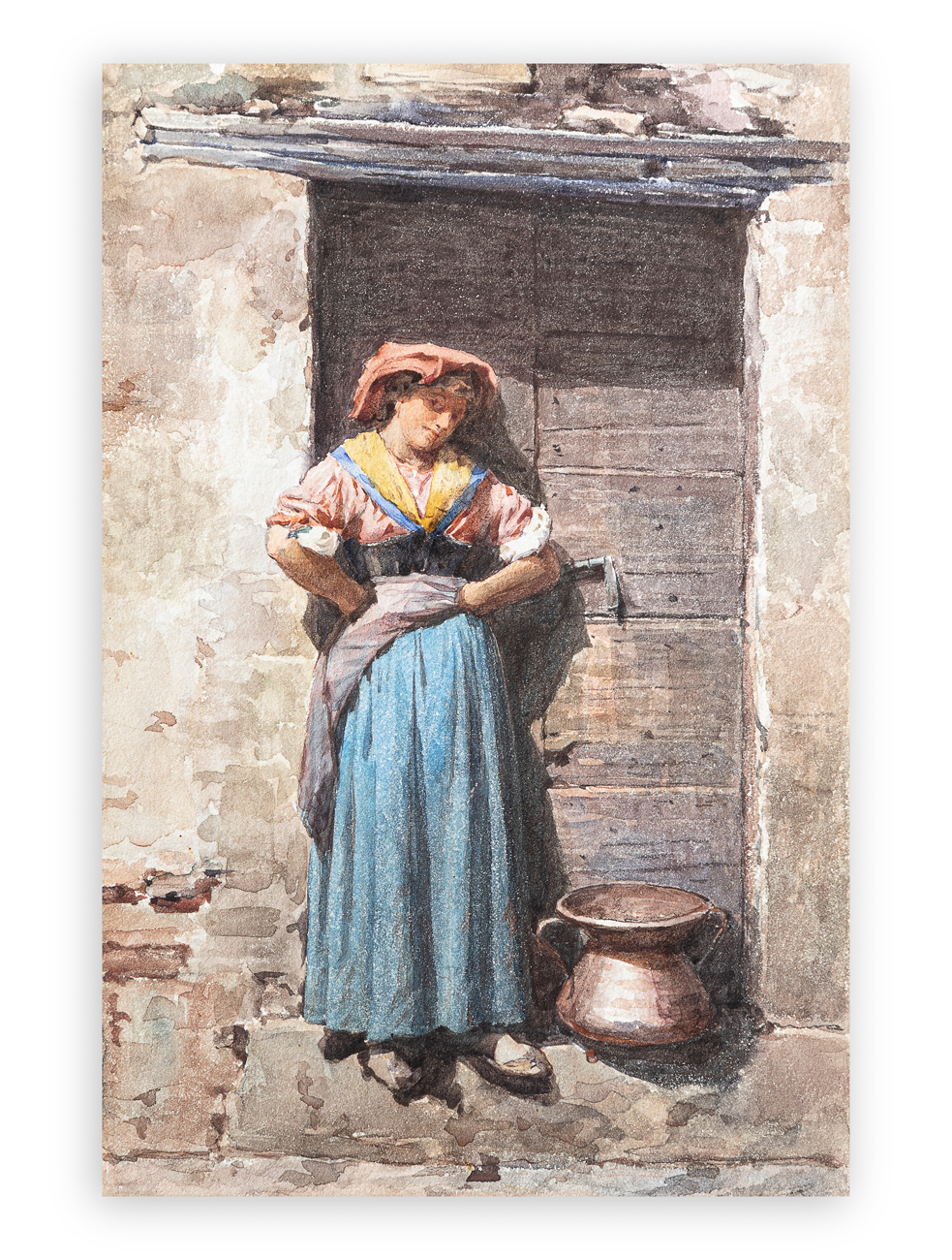 Lotto unico di 2 opere ad acquerello su cartone raffiguranti popolani