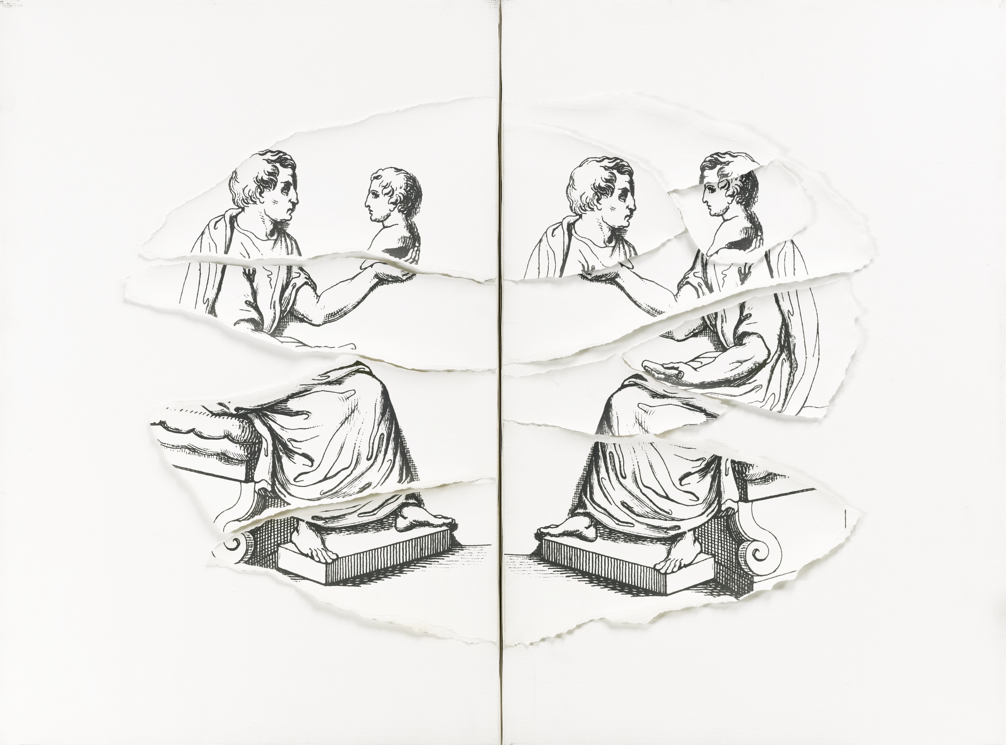 GIULIO PAOLINI N. 1940 SENZA TITOLO signed and dated 1977 on the reverse, collage on prepared canvas firmato e datato 1977 sul retro collage su tela preparata cm 60x80 (due elementi 60x40 cm ciascuno) PROVENANCE Studio Marconi, Milano Ivi acquisito dall'attuale proprietario nel 1979 EXHIBITED Milano, Galleria Pack, Protagonisti dell'Arte Italiana 1960-1970, 2001 LITERATURE Maddalena Disch, Giulio Paolini. Catalogo ragionato, Milano 2008, p. 360, n. 349, illustrato