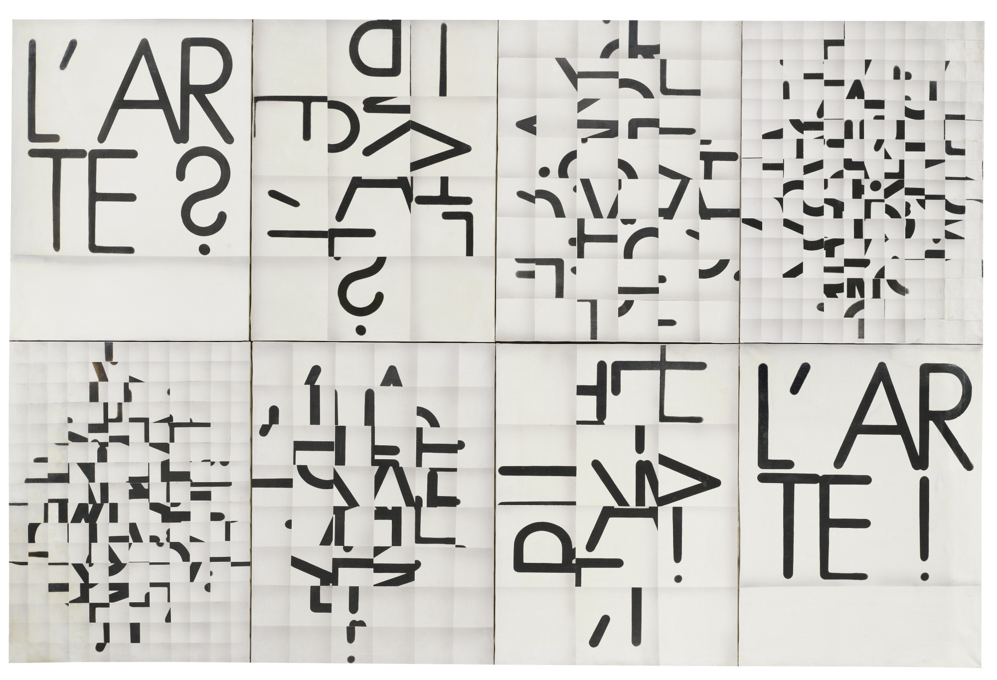 BRUNO DI BELLO N. 1938 L'ARTE? signed on each element, ink aerbrush on photographic canvases, 8 element. Executed in 1969 firmato sul retro di ogni elemento 8 tele fotografiche aerografate con inchiostro di china cm 120x180 Eseguito nel 1969 PROVENANCE Opera acquistata dall'attuale proprietario direttamente dall'artista negli anni Settanta