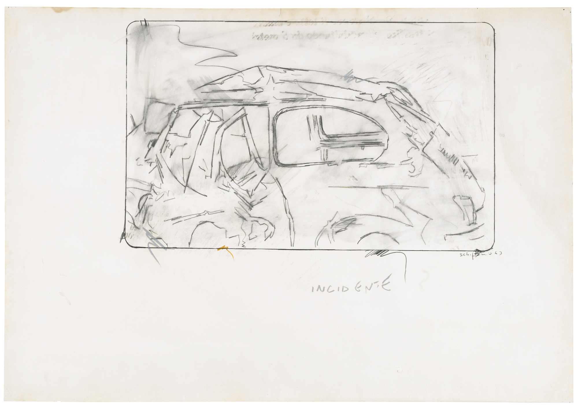 MARIO SCHIFANO 1934 - 1998 INCIDENTE signed, titled and dated 63, pencil and pastels on paper firmato, intitolato e datato 63 grafite e pastelli su carta cm 68x98 Opera registrata presso l'Archivio Mario Schifano, Roma, con il n. 02615140301 L'opera è accompagnata da certificato su fotografia rilasciato dall'Archivio Mario Schifano, Roma PROVENANCE Galleria Il Centro, Napoli Ivi acquistato dall'attuale proprietario
