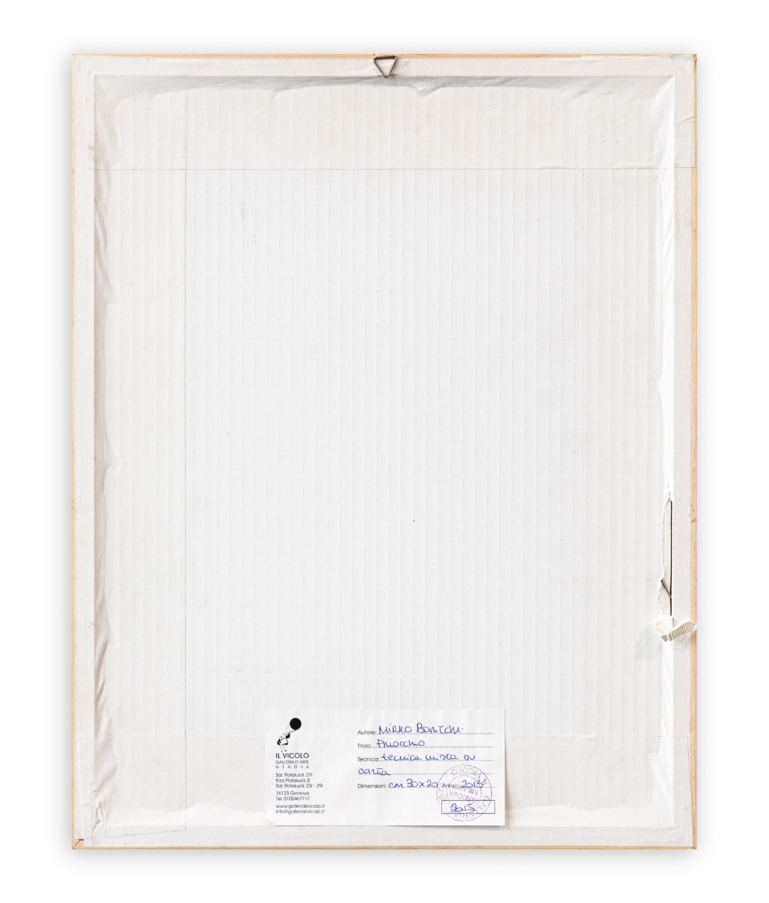 Etichetta e timbro della Galleria Il Vicolo (GE) al retro del cartone protettivo