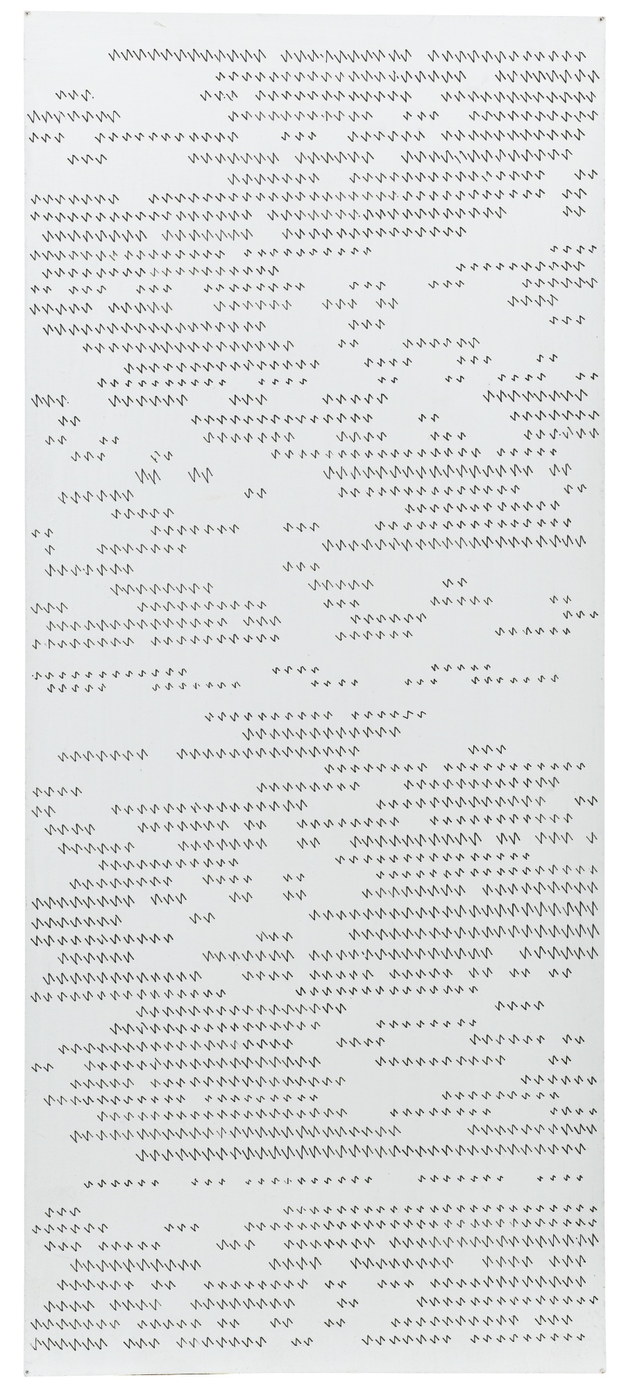 DADAMAINO 1930-2004 L'ALFABETO DELLA MENTE - LETTERA 12 signed, titled and dated 1980 on the reverse, ink on syntetic canvas firmato, intitolato e datato 1980 sul retro inchiostro su tela sintetica cm 51X22 Opera registrata presso l'Archivio Dadamaino, Somma Lombardo, con il n. 164/13 L'opera è accompagnata da certificato su fotografia rilasciato dall'Archivio Dadamaino, Somma Lombardo EXHIBITED Venezia, XXXIX Biennale Internazionale d'Arte, 1980