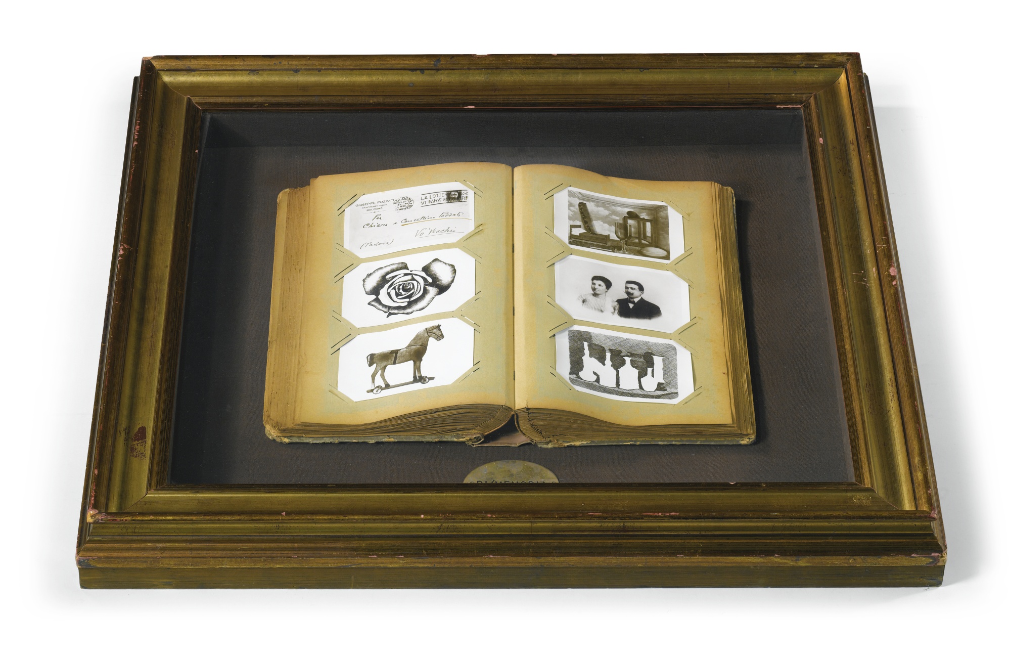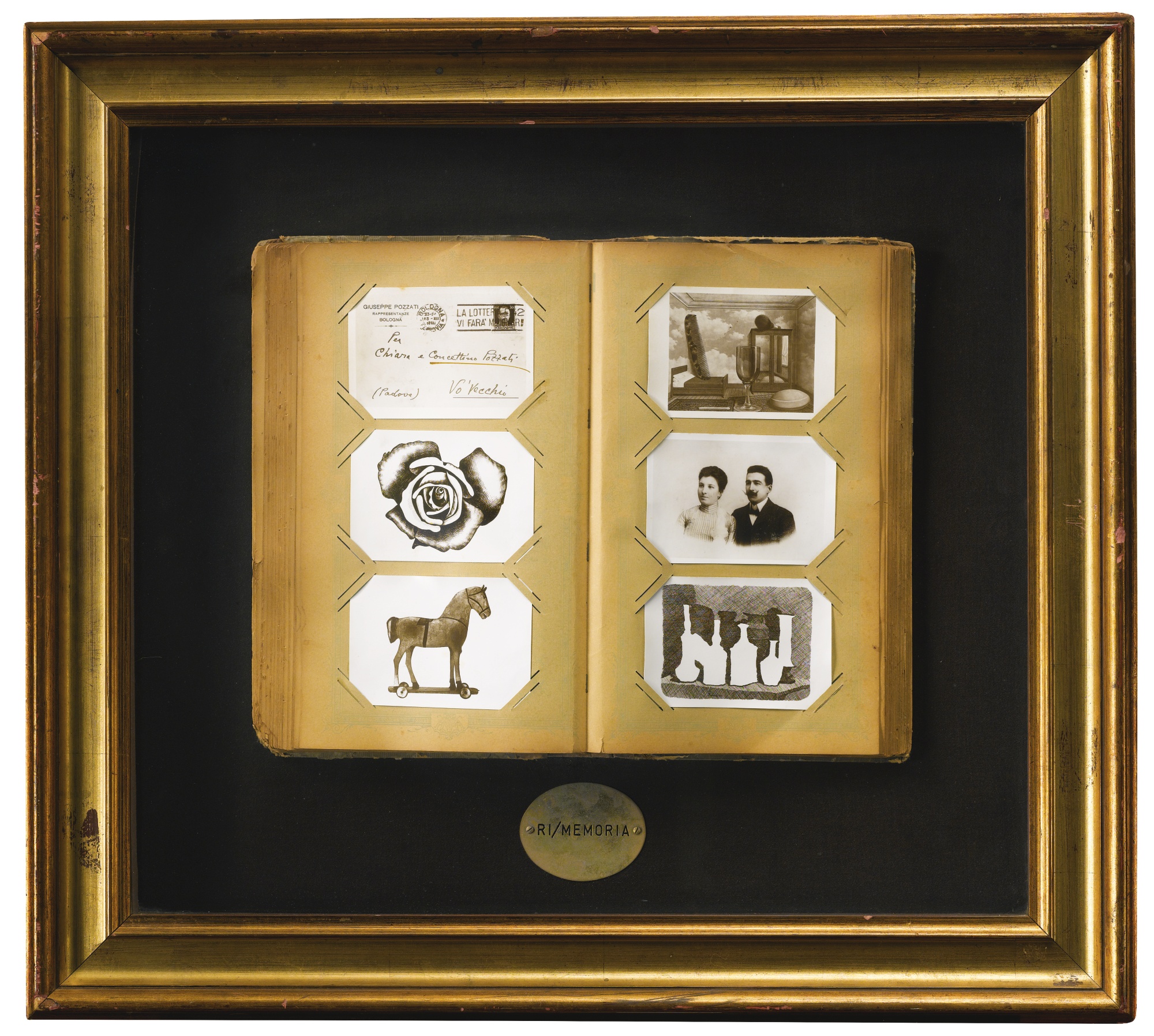 CONCETTO POZZATI N. 1935 RI-MEMORIA signed, titled and dated 1978 on the reverse, book and photographs on panel. Executed in 1978 firmato, intitolato e iscritto sul retro libro e fotografie su tavola cm 63x55x5 Eseguito nel 1978 Opera registrata preso l'Archivio Generale Concetto Pozzati, Cesena, con il n. 1916/10 L'opera è accompagnata da certificato su fotografia rilasciato dall'Archivio Concetto Pozzati, Cesena