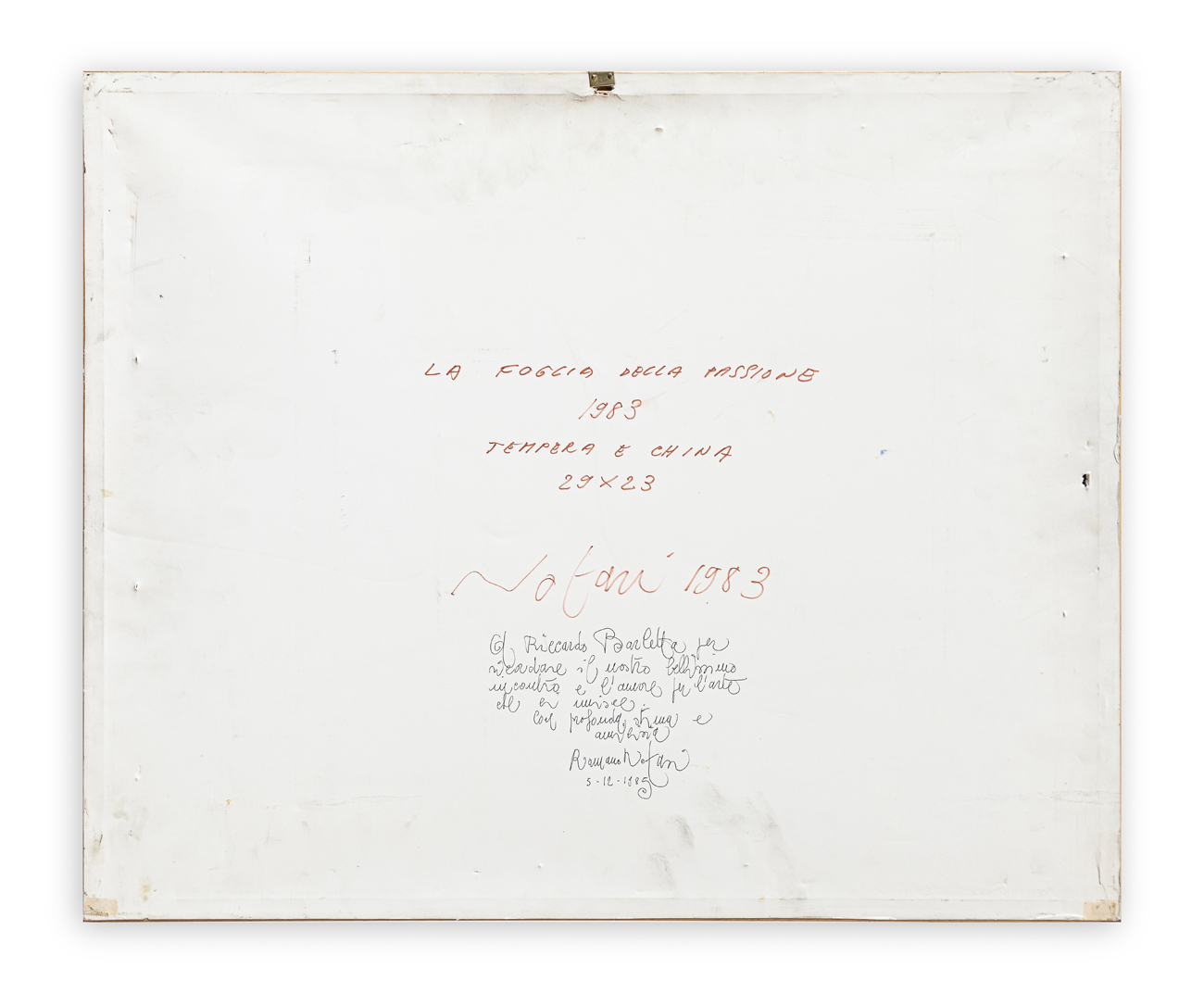 Firma, titolo, datazione, tecnica, misure e dedica ad personam al retro del cartoncino protettivo