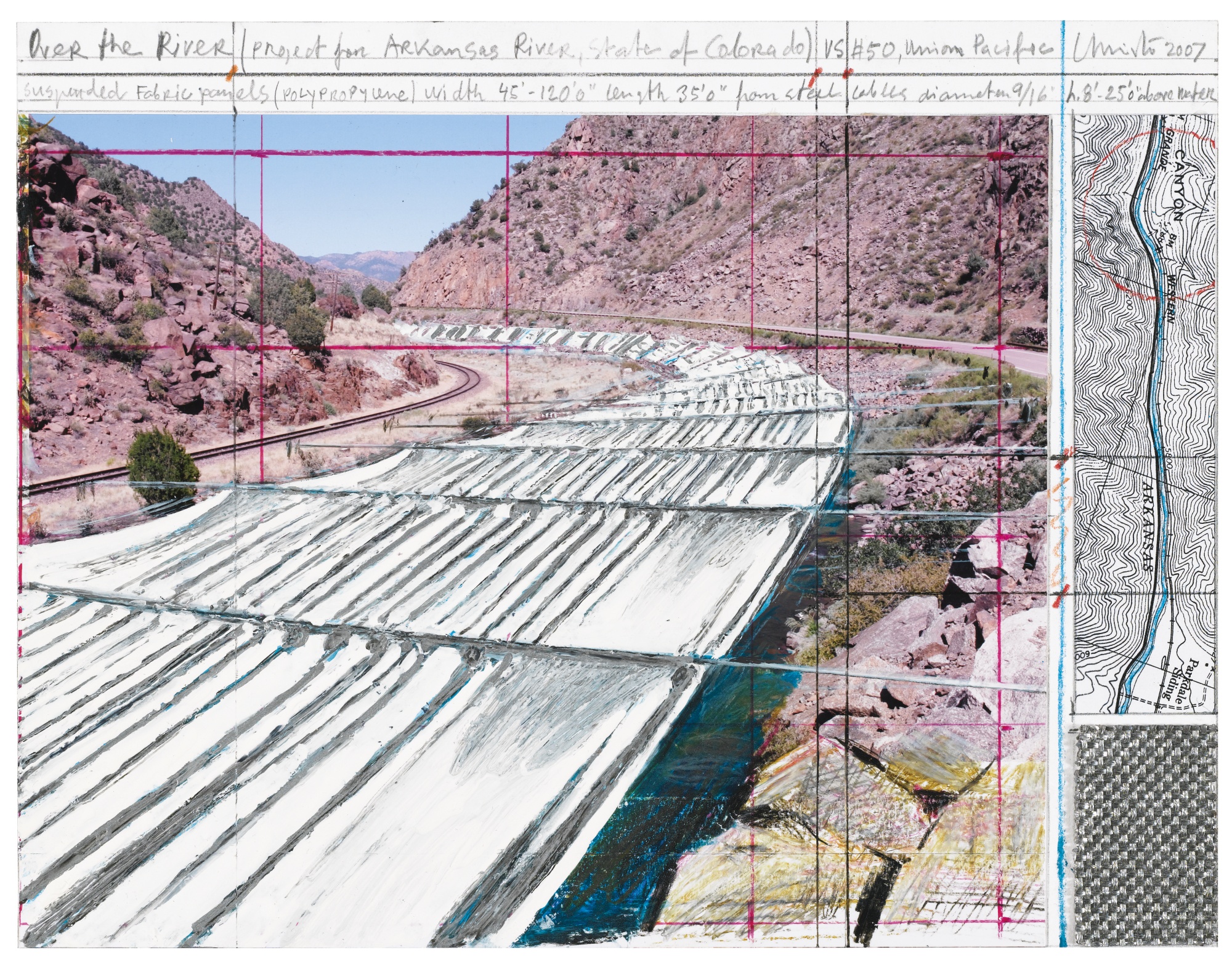 CHRISTO E JEANNE-CLAUDE N. 1935 E 1935-2009 OVER THE RIVER. PROJECT FOR THE ARKANSAS RIVER, STATE OF COLORADO signed and dated 2007, pencil, enamel, pastels, photograph by Wolfang Volz, fabric and map on panel firmato e datato 2007 matita, smalto, pastelli a cera, fotografia di Wolfang Volz, tessuto e mappa su tavola cm 21,5x28 Opera accompagnata da certificato su fotografia firmato dall'artista