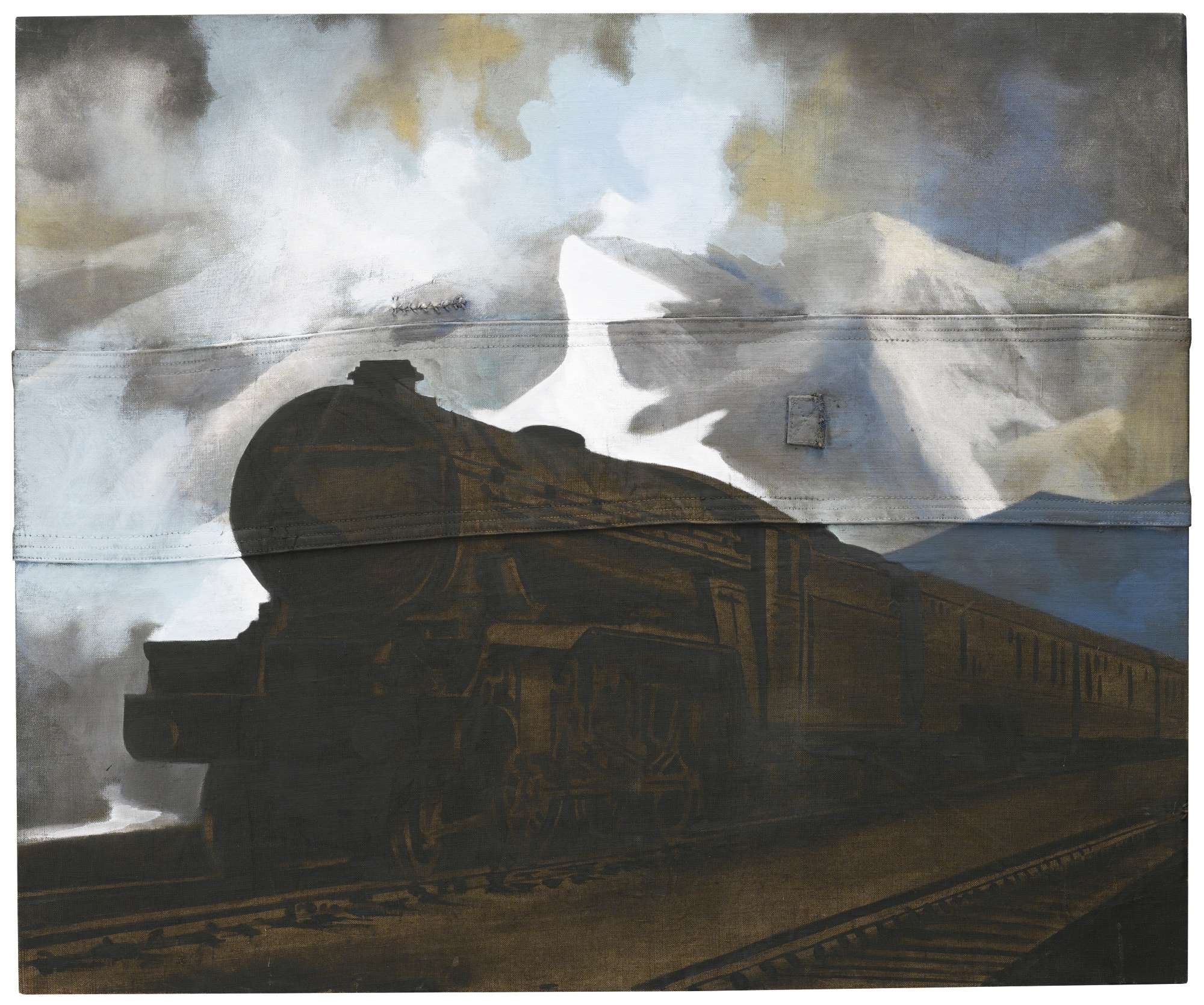 LUCA PIGNATELLI N. 1962 TRENO signed, titled and dated Milano 2004 on the reverse, oil on canvas firmato, intitolato e datato Milano 2004 sul retro olio su telone ferroviario cm 100x121