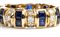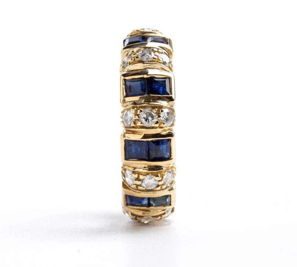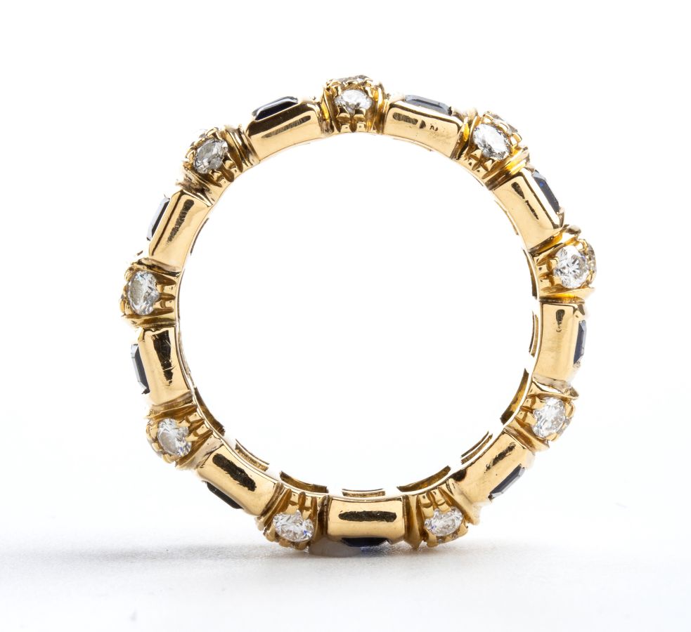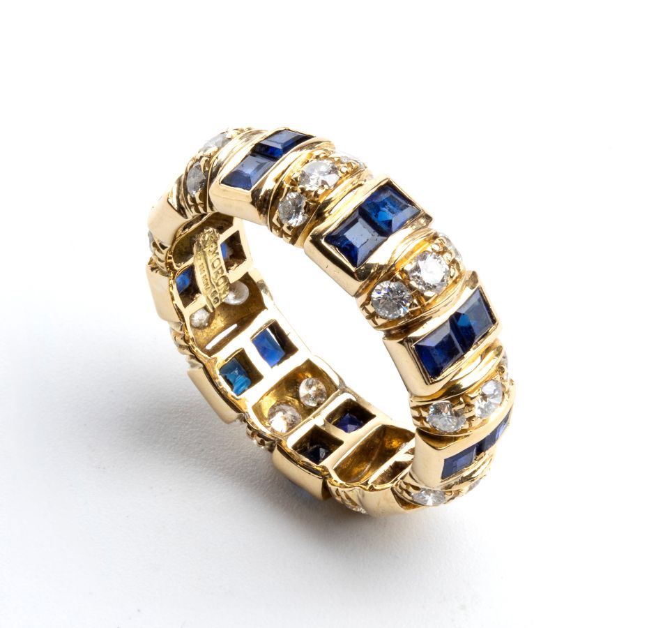 in oro giallo 18k, incastonata con linea di coppie di zaffiri separati da tre diamanti. Firmato F. MORONI.