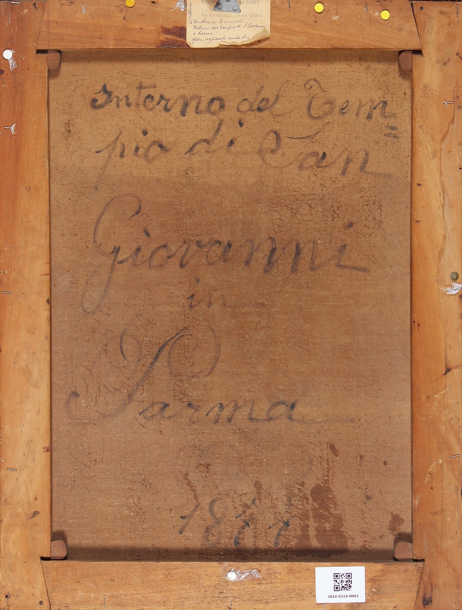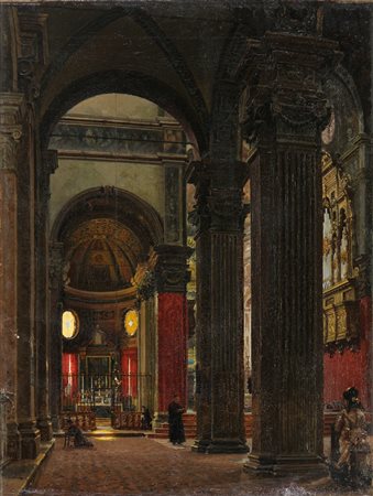 VENTURINI TANCREDI (n. 1857) Interno della chiesa di San Giovanni a Parma. 1877. Olio su tela . Cm 50,50 x 67,00. Firma e data in basso a destra. Al retro titolo e anno, cartiglio della Galleria Mazzoni La Spezia.