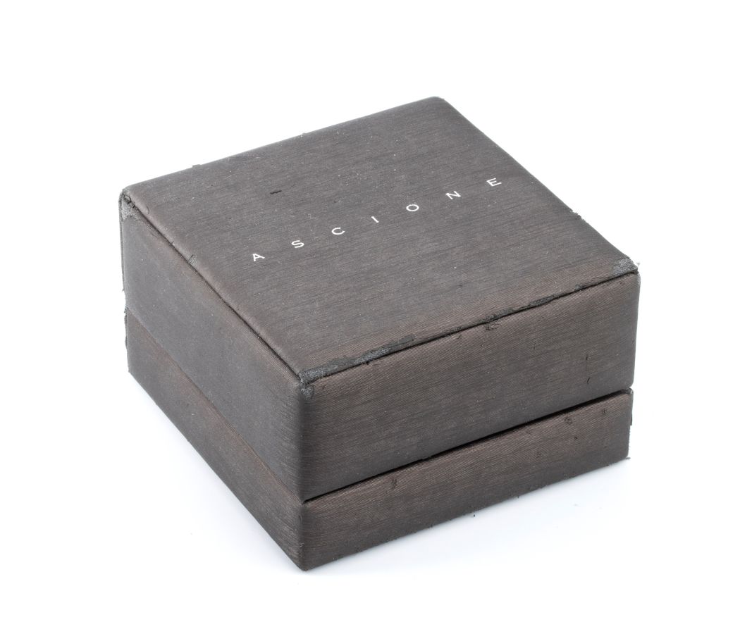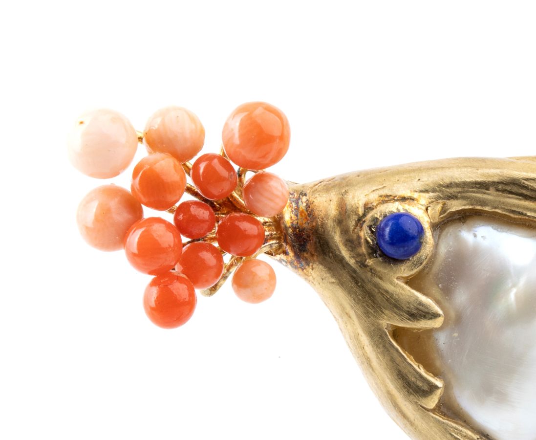 Il corpo centrale del pesce è in madreperla, occhio in piccolo lapislazuli, bolle in piccole sfere di corallo cerasuolo (corallium elatius). Accompanata da scatola firmata ASCIONE.