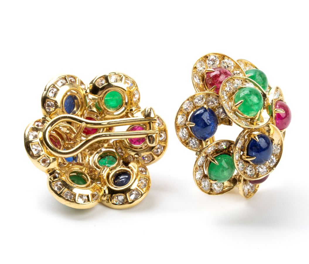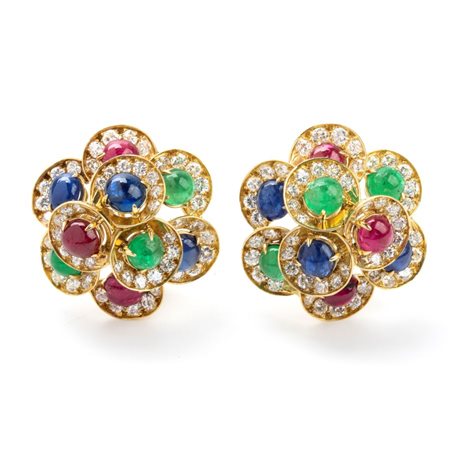 Lotto 75 | Paio di orecchini in oro giallo con diamanti e cabochon di smeraldi, zaffiri e rubini