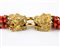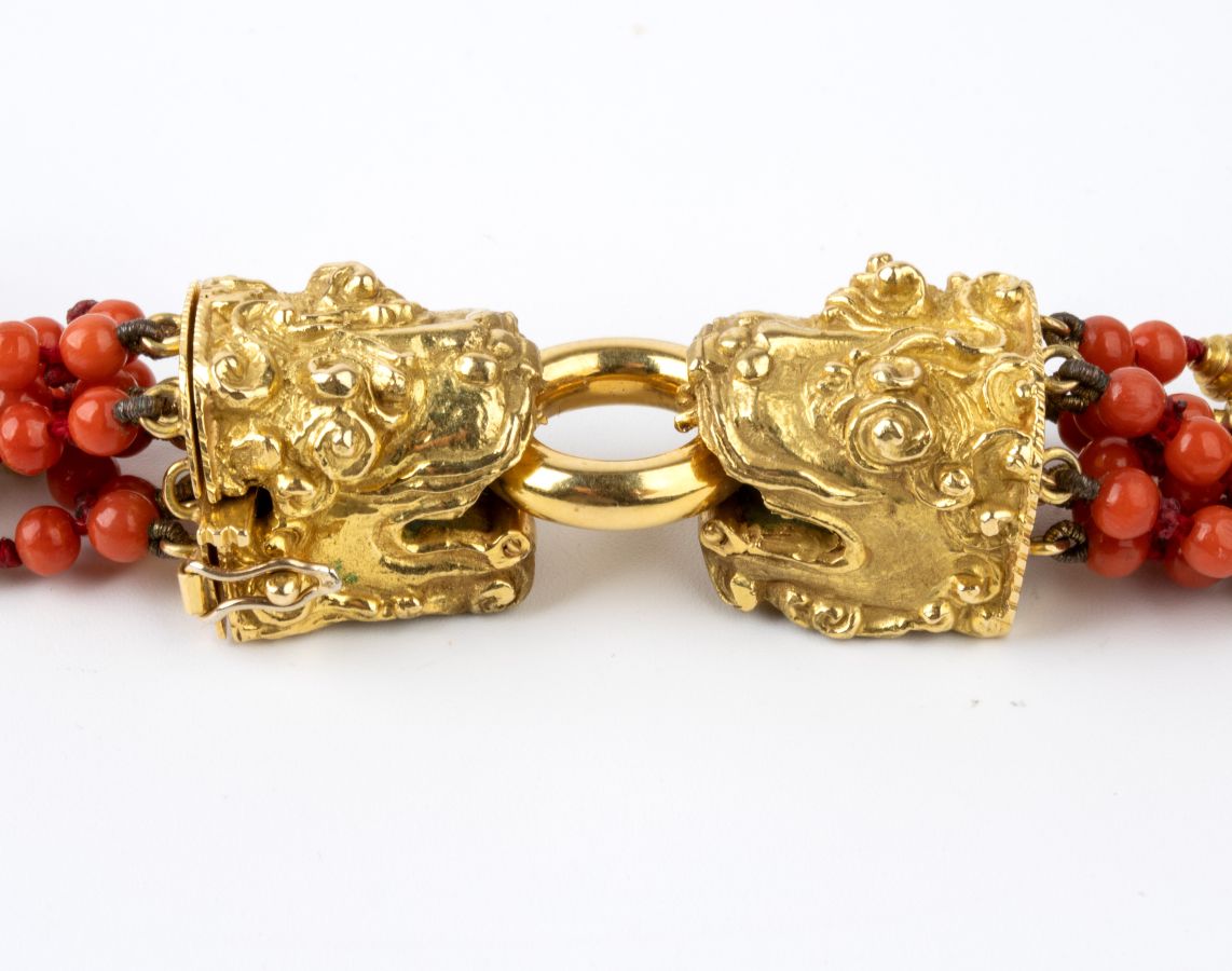 composto da 7 fili di piccole sfere di corallo Mediterraneo (Corallium Rubrum) con fermezza raffigurante due teste di animali fantastici e distanziali in oro giallo 18k.