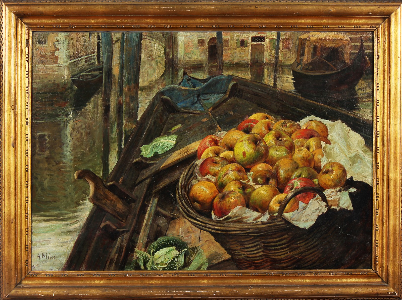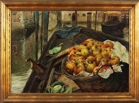 MILESI ALESSANDRO (1856 - 1945) Natura morta in gondola. Olio su tela . Cm 100,00 x 70,00. Firmato in basso a sinistra.